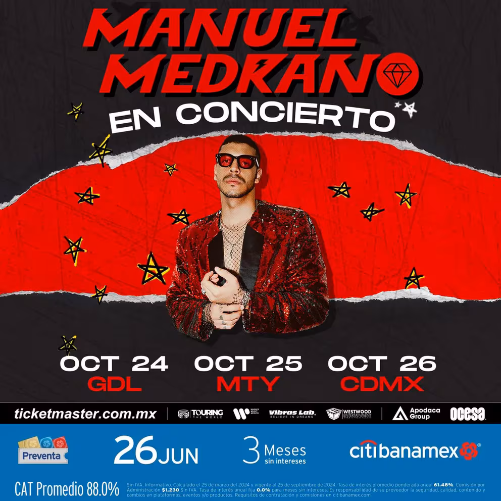 Colombia se hace presente cada vez que se escucha la voz de Manuel Medrano, cantante y compositor colombiano que viene a la perla tapatía a presentar su lado más romántico en la república mexicana; a continuación te presentamos todos los detalles de este próximo concierto en Guadalajara. Medrano inició su camino musical a través de redes sociales al versionar canciones de otros artistas y fue en el 2015 cuando comenzó a tener mayor reconocimiento con la canción Una vez y otra vez; sin embargo, fue hasta que lanzó Bajo el agua que logró saltar a la fama.Si algo representa al originario de Cartagena, es su gran repertorio para corear canciones como: "La distancia", "si pudiera", "donde nadie pueda ir", entre muchas otras.La gira de Manuel Medrano en nuestro país estará presente en las tres ciudades principales, empezando por la Ciudad de México (CDMX), Guadalajara y Monterrey.La primera presentación que llevará a cabo el cantante colombiano será el próximo 24 de octubre de 2024 en el Teatro Diana, ubicado en Guadalajara, Jalisco.El 25 de octubre de 2024 se realizará el segundo concierto del cantante y tendrá lugar en el Auditorio Citibanamex, en Monterrey, Nuevo León.La fecha con la que Manuel Medrano cerrará su paso por el territorio mexicano será el próximo 26 de octubre de 2024 en el Auditorio Nacional de la CDMX.La preventa tendrá lugar el próximo 26 de junio a partir de las 11:00 horas y será exclusiva para clientes Citibanamex. Por otro lado, la venta general de accesos comenzará a partir del próximo 27 de junio a partir de las 11:00 horas.Y tú, ¿asistirás a esta velada? SM