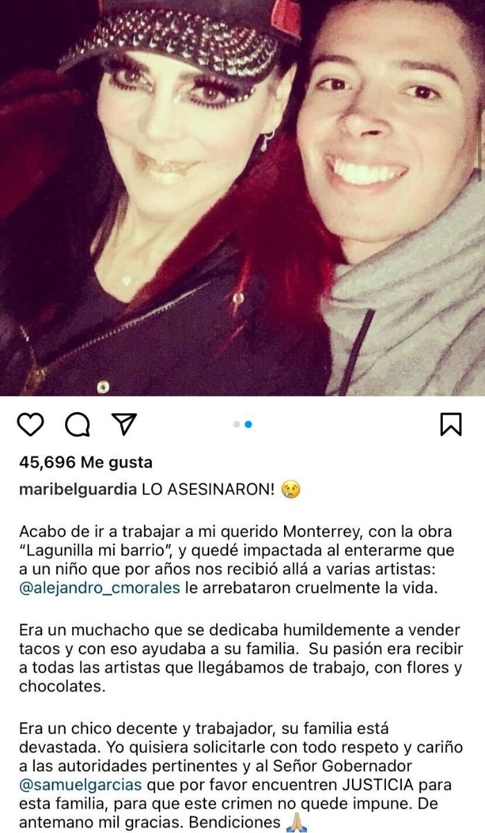 El mundo del espectáculo no deja de vestir de luto; esta ocasión no es por algún ícono del cine o la televisión, sino por el asesinato de un joven llamado Jesús Alejandro Cerda, en Monterrey, Nuevo León.El chico era conocido como "El taquero de las estrellas", ya que solía atender a varias celebridades, quienes lamentaron el crimen.El muchacho, de 25 años, fue privado de su libertad el pasado domingo 19 de marzo, ese mismo día fue encontrado sin vida y con huellas de asfixia.Tras los violentos hechos, Maribel Guardia no se quedó de brazos cruzados y decidió usar su Instagram para hacer un serio llamado al gobierno de Nuevo León y visibilizar el asesinato. "Su pasión era recibir a todas las artistas que llegábamos de trabajo, con flores y chocolates. Era un chico decente y trabajador, su familia está devastada. Yo quisiera solicitarle con todo respeto y cariño a las autoridades pertinentes y al Señor Gobernador @samuelgarcias que por favor encuentren JUSTICIA para esta familia, para que este crimen no quede impune", escribió la actriz.Seguidores de la actriz de 63 años agradecieron la publicación, pues aseguran que, de no ser por ella, casi nadie se habría enterado del homicidio y, ahora, es más probable que las autoridades tomen cartas en el asunto. SL