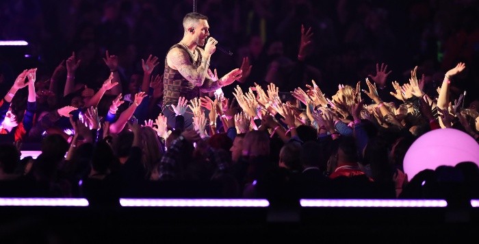 La banda Maroon 5 se apoderó de la cancha del Estadio Mercedes-Benz de Atlanta para amenizar el show de medio tiempo del Super Bowl LIII entre los Patriots de Nueva Inglaterra y los Rams de Los Ángeles.Con un conjunto de pantalón y chamarra negra con toques rojos, naranja y rosa, Adam Levine salió al escenario para interpretar "Harder to Breathe" y así puso de pie a los asistentes.Una pequeña escena del capítulo donde sale la banda musical de Calamardo, apareció en las pantallas para hacer un homenaje a su creador Stephen Hillenburg, quien falleció el pasado 26 de noviembre. Después del video que duró algunos segundos, apareció entre llamas el rapero Travis Scott quien interpretó "Sicko Mode".Levine cantó grandes éxitos como "This Love" y "She Will be Loved".Además la banda interpretó "Girls Like You" acompañado de un grupo de coristas y tambores que invadieron el escenario.El rapero Big Boy se hizo presente en el escenario con el tema "Kriptonite".Uno de los momentos que hizo prender a las fans de Adam Levine fue cuando se quitó la camisa y comenzó a moverse al ritmo de "Moves Like Jagger" para después cerrar el espectáculo con "Sugar".Con esta presentación, Maroon 5 se une a estrellas de la talla de Madonna, Beyoncé, Coldplay, Bruno Mars, Lady Gaga, Katy Perry y Justin Timberlake, quienes cosecharon audiencias millonarias con sus respectivos espectáculos.JB
