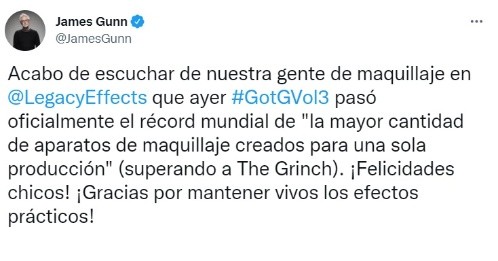 Aunque falta más de un año para que la nueva entrega de “Guardianes de la Galaxia. Vol 3” llegue a las salas de cine, tal parece que la producción encabezada por James Gunn ha logrado un peculiar récord mundial aunque la película aún esté en proceso de filmación teniendo como protagonistas nuevamente a Chris Pratt, Zoe Saldaña, Dave Bautista, Pom Klementieff y Karen Gillan.A través de sus redes sociales, James Gunn, quien recientemente dirigió y escribió la serie “Peacemaker” para HBO Max, compartió el logro que ha conseguido la tercera entrega de la saga de “Guardianas de la Galaxia”, pues gracias al maquillaje es que el filme ha arrebatado la corona que poseía la producción y equipo de caracterización de Ron Howard en “El Grinch”, protagonizada por Jim Carrey.El récord mundial se enfoca en reconocer que “Guardianes de la Galaxia”, en su volumen 3, es la película que más aplicaciones de maquillaje y prostéticos ha utilizado, siendo que este logró ninguno otro filme lo había ganado desde que “El Grinch” lo obtuvo.“Escuché gracias a nuestro equipo de maquillaje en Legacy Effects que ayer ‘Guardianes de la Galaxia 3’ superó oficialmente el Récord Guinness mundial por la mayor cantidad de dispositivos de maquillaje creados para una sola producción, superando a ‘El Grinch’. Felicidades, muchachos. Gracias por mantener con vida en el cine los efectos prácticos”, indico el también director del “Escuadrón Suicida 2” mediante su cuenta oficial en Twitter @JamesGunn, refiriéndose al trabajo de Legacy Effects, que ha trabajado en las producciones de “The Mandalorian” y “Godzilla vs. King Kong”.Aunque no se han dado más detalles sobre cuáles son los maquillajes y material que dan el reconocimiento a “Guardianes de la Galaxia”, a fin de evitar spoilers sobre lo que se verá en su tercera entrega, el récord mundial tendría que superar lo que “El Grinch” logró en su producción, pues incluso, el departamento especializado en caracterización ganó el Oscar a “Mejor Maquillaje” en la ceremonia del 2001, tras llegar a las salas en el año 2000, pues se informó que Jim Carrey tuvo que utilizar la indumentaria y maquillaje de “El Grinch” durante los 92 días de filmación de la película, proceso que cada jornada laboral le implicaba un promedio de ocho a nueve horas para lograr la caracterización final.Aunque la mayoría de filmes de Marvel apuestan por los efectos visuales en post-producción y hacen uso de tecnología GCI para dar realismo a sus personajes y poderes sobrehumanos, James Gunn había declarado que para su trabajo en “Escuadrón Suicida 2”, para la franquicia de DC, prefería sacar provecho y creatividad con el maquillaje y efectos prácticos para dar un sentido más realista y artístico a lo que se ve en pantalla.“El CGI es importante. Pero usé efectos prácticos siempre que fue posible, incluyendo los sets más grandes y hermosos que he visto, ubicaciones reales, vestuario, pirotecnia y efectos prostéticos”, indicó.Zoe Saldaña, quien da vida a “Gamora”, suele compartir en su cuenta de Instagram diversos videos en los que muestra su proceso de caracterización y maquillaje, incluso revelando lo que hace entre las largas jornadas sentada mientras aplican el peculiar color verde que da identidad a su personaje, hecho que ha sido muy celebrado por sus seguidores quienes le agradecen poder conocer cómo es el detrás de cámaras desde una perspectiva más personal y divertida.MF