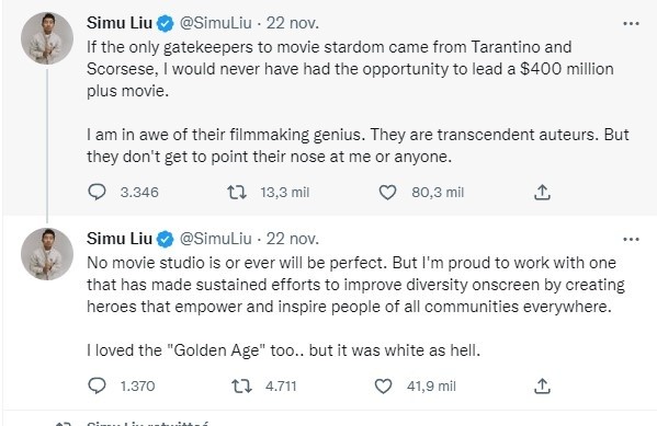 Luego de las fuertes declaraciones hechas por el director Quentin Tarantino sobre los actores de películas de Marvel, la estrella Simu Liu -conocido por su papel en “Shang-Chi”- defendió su trabajo y a sus compañeros, agrandando la polémica sobre si estas filmaciones son cine o no.La polémica sobre el cine de Marvel volvió a crecer luego de que Tarantino dijera en una entrevista en el podcast “2 Bears, 1 Cave”, que los actores de Marvel no pueden ser considerados estrellas de cine, sino los mismos personajes eran los que generaban el éxito de los filmes.Por ello, Simu Liu, se dirigió a sus seguidores de Twitter para responder a Quentin Tarantino y, de paso, al director Martin Scorsese, quien también ha criticado el cine de superhéroes.“Si los únicos guardianes del estrellato cinematográfico fueran Tarantino y Scorsese, nunca habría tenido la oportunidad de protagonizar una película de más de $400 millones de dólares”, escribió Liu. “Estoy asombrado de su genio cinematográfico. Son autores trascendentes. Pero no pueden señalarme ni a mí ni a nadie”.Algunos de sus seguidores mostraron su apoyo al actor, y otros más pusieron en duda sus palabras al recordar que Simu Liu no ha sido solicitado por películas de gran producción más que “Shang-Chi y la leyenda de los 10 anillos”.El actor chino-canadiense, agregó que "el cine no es ni será perfecto”, pero aún así está “orgulloso de trabajar con uno que ha realizado esfuerzos sostenidos para mejorar la diversidad en la pantalla al crear héroes que empoderan e inspiran a personas de todas las comunidades en cualquier parte del mundo”.Simu finalizó criticando la época del Hollywood en la “Edad de Oro”, tachándola de “blanca como el infierno”.Se espera que Simu Lui aparezca en más producciones de Marvel en la Fase 5 del Universo Cinematográfico (UCM), sin embargo, hasta el momento se desconoce en qué producción.AC