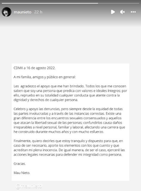 A través de su cuenta en Instagram, el standupero Mauricio Nieto respondió a las acusaciones que se han hecho en su contra, luego de que la también comediante y productora Melissa Yamel compartió públicamente en redes sociales un presunto abuso sexual, en 2018, por parte del comediante, al referir que ella no dio consentimiento para tener relaciones íntimas al estar alcoholizada.En su comunicado, Mau Nieto agradeció el apoyo que le han brindado e indicó que “todos los que me conocen saben que soy una persona que predica con valores e ideales íntegros”, al también señalar que reprueba cualquier conducta que atente contra la dignidad y derechos de cualquier persona.“Celebro y apoyo las denuncias, pero siempre desde la equidad de todas las partes involucradas y a través de las instancias correctas”, apuntó al subrayar que “existe una gran diferencia entre los encuentros sexuales consensuados y aquellos que atacan la libertad sexual de las personas”, expresó y aunque no mencionó en ningún momento el nombre de la mujer que lo acusa, enfatizó en que un mal manejo de información puede confundir y “causa daños irreparables a nivel personal, familiar y laboral, afectando una carrera que he construido durante muchos años y con mucho esfuerzo”.En postura, Mauricio Nieto recalcó estar tranquilo y dispuesto a colaborar en caso de ser necesario y también para mostrar los elementos que comprueben su inocencia: “de igual manera, de ser el caso, ejerceré las acciones legales necesarias para defender mi integridad como persona”.Además de Melissa Yamel, otra joven identificada como Ximena Moreno, también utilizó Twitter para compartir su experiencia con Mauricio Nieto, al revelar que durante una reunión fue drogada por el comediante.MF