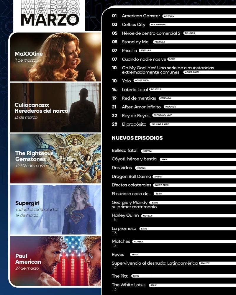 La plataforma de streaming Max ya tiene preparados sus estrenos del 24 al 30 de marzo para cerrar el mes con lo mejor del entretenimiento, desde su destacada sección “del cine a Max” con las películas favoritas directas de la pantalla grande, hasta los documentales más interesantes. Esta semana, en las películas destaca “El propósito” un filme que se estrenó hace poco en cines y que si buscas una peli sobre la toma de decisiones y la espiritualidad, esta es para ti. Después de terminar la preparatoria sin tener un rumbo claro para su futuro, Isaiah Wright recibe un reto de su madre y un exitoso hombre de negocios para que defina un mejor camino en su vida. A través de las oraciones de su madre y el acompañamiento bíblico de su nuevo mentor, Isaiah empieza a descubrir el propósito que Dios tiene para él. Mientras que esta semana, también llega “La familia Paul” en la que luego de haberse desarrollado ante los ojos del mundo como pioneros en la creación de contenido, los carismáticos Jake y Logan Paul se aventuran en un terreno completamente distinto: los realities de televisión.El propósito- 28 de marzo de 2025Demonios de Hollywood- 24 de marzo de 2025La familia Paul- 27 de marzo de 2025 NA