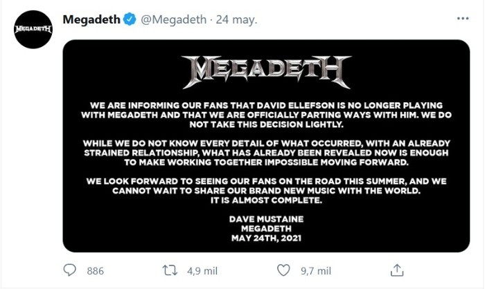 La banda de metal Megadeth ha decidido prescindir de su bajista, David Ellefson, semanas después de que salieran a la luz unos mensajes en los que intercambiaba contenido sexual con una mujer que supuestamente era menor de edad."Informamos a nuestros fans que David Ellefson ya no tocará con Megadeth y que oficialmente nos separamos de él. No tomamos esta decisión a la ligera", aseguró la banda en un comunicado publicado en sus redes sociales.A principios de mayo, se difundieron en Internet una serie de mensajes e imágenes explícitas en los que Ellefson se insinuaba sexualmente a una chica que supuestamente era menor de edad, algo que el músico negó al insistir en que se trataban de "interacciones privadas y adultas, manipuladas y sacadas fuera de contexto".En su defensa, el bajista publicó un mensaje donde la supuesta mujer afirmaba que era adulta y que todo el intercambio fue "consentido".Sin embargo, esa publicación se borró después y nunca llegó a confirmarse la identidad de la chica.Ante la confusión, la banda despidió al bajista tras explicar que ya tenían una mala relación antes de que pasara el incidente."Si bien no conocemos todos los detalles de lo ocurrido, con una relación que ya era tensa, lo que se ha revelado ahora es suficiente para que sea imposible avanzar juntos. Esperamos ver a nuestros fans de gira este verano y compartir nuestra nueva música con el mundo", justificó la formación.JM