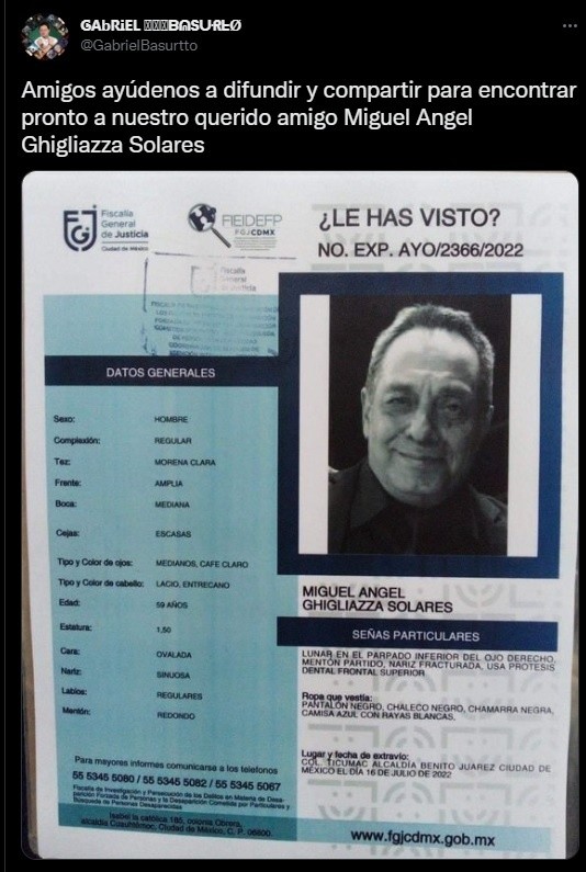 Familiares reportaron la desaparición del actor de doblaje, Miguel Ángel Ghigliazza, en la Ciudad de México.Ghigliazza es reconocido por dar vida a personajes como "La Mole" en las películas de "Los 4 Fantásticos" (2005 y 2007), "Héctor Ado" en "Malo con Carne" y "Jango Fett" en el universo de "Star Wars".Miguel Ángel fue visto por última vez el sábado 16 de julio, en Bolívar y avenida 17, en la colonia San Simón Ticumac, cerca del Metro Nativitas.Según los familiares, Ghigliazza conducía un vehículo Spark rojo, de placas B58-BHE.Evelyn Martha Ghigliazza Solares, hermana de Miguel Ánge,l se encuentra en espera de más información, que puede recibir en su perfil de Facebook.AC
