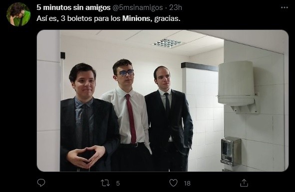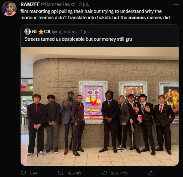 Además de arrasar en taquilla con más de 200 millones de dólares en su primer semana de estreno, “Minions: Nace un villano” ha dejado también una increíble tendencia en TikTok que —para bien o para mal— ha sido prohibido en algunos cines de Reino Unido y Estados Unidos, además de los indiscutibles memes que han llenado las redes sociales.La película animada cuenta el origen de “Gru”, un villano fracasado que, rodeado de “Minions”, busca integrarse a un grupo de chicos malos: los “Vicious 6”.Tras el buen recibimiento de los fans de “Mi villano favorito”, los memes y reacciones no paran de invadir el Internet con comentarios como: “La gente de marketing de películas se tira de los pelos tratando de entender por qué los memes de Morbius no se tradujeron en boletos, pero los memes de Minions sí”, y “Cómo me vas a decir que no te gustan los Minions? Sólo mírenlos”.“Minions: Nace un villano” se estrenó el pasado 30 de junio tras varios retrasos por lapandemia de COVID. En la animación se explora el origen de “Gru”.Durante su primer fin de semana de estreno, “Minions 2” debutó con una recaudación estimada de 108.5 millones de dólares sólo en Norteamérica, con una estimación de alrededor de 128 millones el 4 de julio en EU. A nivel mundial, la película ha sumado unos 202.2 millones de dólares "Es un debut tremendo", dijo Jim Orr, presidente de distribución nacional de Universal, "Está exhibida de forma muy amplia en toda Norteamérica. En todos los mercados va extraordinariamente bien. Las familias se sienten muy a gusto llevando a todos sus hijos al cine. Estos resultados hablan por sí mismos”.AC