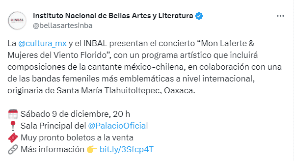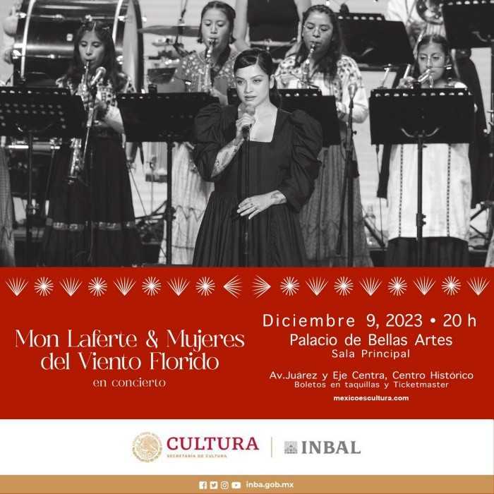 Mon Laferte en compañía con Mujeres del Viento Florido ofrecerá un concierto el próximo 9 de diciembre en la Sala Principal del Palacio de Bellas Artes. Esto es un gran logro para la artista chilena, pues no son muchos los cantantes que se han presentado en este recinto cultural, algunos de ellos son Juan Gabriel, Plácido Domingo, Pedro Infante y Mariachi Vargas, Alejandro Fernández, Mijares, entre otros.Un programa artístico integrado con música y canciones tradicionales oaxaqueñas que forman parte de la diversidad musical de México, conforman el concierto de Mon Laferte y Mujeres del Viento Florido, que la cantante chileno-mexicana, en colaboración con la banda femenil oaxaqueña el 9 de diciembre de 2023, a las 20:00 horas.En este concierto de intercambio cultural entre México y Chile, el público escuchará canciones que Laferte presentaron en el Lincoln Center de Nueva York, en febrero pasado, piezas compuestas por la cantante, además de interpretar temas que integran parte fundamental del repertorio en la música mexicana, como Dios nunca muere, Canción mixteca, Te juro que volveré, María tepozteca, Calaveras, Se va la vida, Se me va a quemar el corazón, Te vi, entre otras obras.Así lo dio a conocer, mediante un comunicado, la Secretaría de Cultura federal, a través del Instituto Nacional de Bellas Artes y Literatura (Inbal), quién señaló que la orquesta Mujeres del Viento Florido, agrupación originaria de Santa María Tlahuitoltepec, comunidad ubicada en la región mixe de Oaxaca, reivindica la interpretación y el estudio de la música mexicana para las mujeres de las comunidades indígenas. El colectivo se fundó en noviembre de 2009 como Banda Femenil Regional Mujeres del Viento Florido; desde entonces más de 100 mujeres instrumentistas han sido parte de esta agrupación.Sobre Mon Laferte señala que la cantante, quien obtuvo la nacionalidad mexicana en diciembre 2022, ha ganado cuatro premios Latin Grammy y dos nominaciones a los Grammy, vendiendo millones de álbumes y de discos digitales en Latinoamérica. La artista contemporánea multidisciplinaria, residente en México desde hace 15 años, es reconocida internacionalmente en el campo musical. Se ha presentado en escenarios como el Walt Disney Concert Hall de Los Ángeles, el Madison Square Garden en Nueva York y el Luna Park en Buenos Aires, convocando amplios públicos en América Latina, Estados Unidos y Europa.Mujeres del Viento Florido, cuya tradición de bandas de aliento tiene reconocimiento internacional, está integrada por 58 instrumentistas, bajo la dirección de Leticia Gallardo Martínez y Diana Gabriela Martínez Gallardo, como asistente de dirección, arreglista e intérprete de tuba.Desde 2010 han presentado diversos conciertos y han sido invitadas a eventos como la IV Semana de las Culturas de la Sierra, el Tercer Encuentro Intercultural de Música y Danza Indígena en la ciudad de Puebla, el Primer Encuentro de Bandas Culturales, el Primer Encuentro de Artistas Oaxaqueñas, el Festival Internacional de la Cultura Maya, el 22 Encuentro Nacional de Bandas Tradicionales de Tlayacapan y en La Guelaguetza, entre otras colaboraciones internacionales con reconocidos cantantes mexicanos.Los boletos para el concierto "Mon Laferte y Mujeres del Viento Florido" estarán a la venta a partir del miércoles 25 de octubre de 2023 en las taquillas del Palacio de Bellas Artes y en el Sistema Ticketmaster. MM
