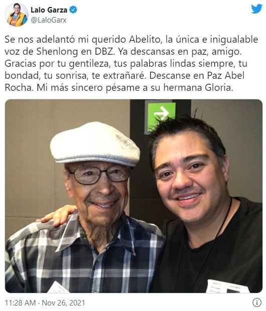 Falleció el actor Abel Rocha, quien prestó su voz a los personajes Shen Long, Emma Daioh Sama y Nail de “Dragon Ball”, también participó en animes como "Naruto", "Digimon: Digital Monsters", "Ranma 1/2" y la caricatura "Hora de aventura".La noticia la dio a conocer Lalo Garza, actor de doblaje que interpreta a Krillyn en "Dragon Ball Z", y fue confirmada por la Asociación Nacional de Intérpretes."Se nos adelantó mi querido Abelito, la única e inigualable voz de Shenlong en DBZ. Ya descansas en paz, amigo. Gracias por tu gentileza, tus palabras lindas siempre, tu bondad, tu sonrisa, te extrañaré", declaró Garza en su cuenta de Twitter.Para su canal de YouTube, Lalo Garza entrevistó en 2018 a Rocha, quien fue "una pieza muy importante en la historia de 'Dragon Ball'", declaró Garza en aquel entonces.En aquella entrevista, Rocha explicó que llevaba más de 20 años dando voz a Shen Long.El actor inició su carrera luego de decirle a su hermana Gloria que probara sus habilidades en el área de doblaje. Y es que Gloria es nada más y nada menos que la "madrina del doblaje" en el campo.Rocha también reveló que tuvo una faceta como cantante en un restaurante y que cantar era una de sus más grandes pasiones."No dejo de trabajar nunca, de disfrutar cada grabación, cada encuentro, de reír, de gozar la vida. Un ejemplo de amor por vivir", escribió en Facebook el actor de doblaje Javier Rivero sobre cómo era Abel Rocha.AF