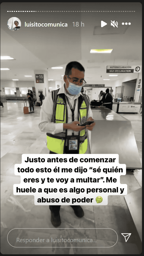 El influencer Luisito Comunica anunció en sus redes sociales que sería multado por la cantidad de 18 mil pesos por utilizar su teléfono dentro del Aeropuerto Internacional de la Ciudad de México (AICM).“Me acaban de poner una multa por usar mi teléfono en el aeropuerto. Aquí les va la historia. Quédense a reírse un rato porque esto es ABSURDO", escribió el youtuber en su cuenta de Instagram. En sus redes sociales, Luisito mostró un video de como un guardia de seguridad le dice reiteradamente que guarde su teléfono; él enfoca a todas las personas a su alrededor que están haciendo uso del teléfono sin recibir ninguna llamada de atención o multa. Comenta que como resultado tuvo que pasar casi dos horas en el aeropuerto esperando a que se realizara el trámite de su multa. Resultó que el oficial “Paulino” que le impuso la multa no tenía autoridad y tuvieron que esperar al veredicto de alguien más. “A mí me huele a abuso de poder”, “Nada más buscaba un soborno”, “En ningún lado decía que eran 18 mil pesos ”, fueron algunas de las frases que Luisito escribió referente a lo sucedido.La cantidad de la multa resultó ser de 6 mil 930 pesos, y el pago se podía hacer únicamente en efectivo.“Fue completamente algo personal y un abuso de poder”, menciona la celebridad de internet.MB