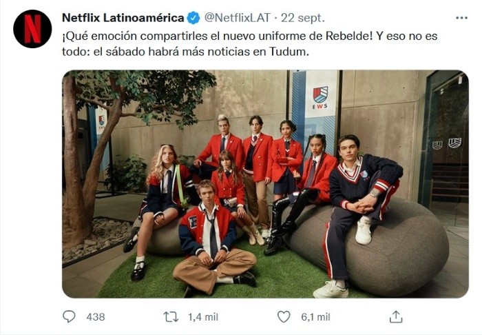 En el adelanto de "Rebelde Way" se reveló la canción oficial de la serie, un aspecto de la ficción que como los seguidores de esta saga conocen es parte importante del éxito que puede tener la serie. Se trata de una nueva versión de "Rebelde", el tema de la versión mexicana.Horas antes de este anuncio, Netflix había mostrado al mundo la primera foto oficial de la serie, donde se aprecia a los actores de "Rebelde" con el uniforme de la Elite Way School, colegio donde se desarrolla la acción.En el clip de apenas 59 segundos, se puede apreciar la reinterpretación del clásico "Rebelde", en donde algunos integrantes aparecen a cuadro y en donde se puede apreciar a Andrea Chaparro, quien será una de las protagonistas de la nueva serie de Netflix. En la nueva imagen en cuanto al uniforme, se dejó de lado el rojo total de los sacos y las corbatas para abrir paso a un vestuario con más variedad y colores: sacos rojos con botones dorados, chamarras rojas con azul, corbatas azul marino, faldas azules y pantalones en color beige.Luego de que se anunció que una plataforma streaming prepara una nueva producción de "Rebelde", Pedro Damián, productor de la versión mexicana de la telenovela que realizó Televisa, dijo que no fue invitado al proyecto, quizá porque la nueva producción que se hará está basada en la original argentina y no en la que él creó, aunque sí tendrá las canciones que él hizo y de las que Damián ya prestó los derechos.En entrevista, Pedro explicó que no participará en la propuesta que prepara Netflix (que planea estrenar en 2022), y que contará con la actuación de Sergio Mayer Mori (hijo de Bárbara Mori) y Andrea Chaparro (hija del comediante Omar Chaparro). "Ellos harán la versión argentina y ocuparán los guiones de la primera versión y no los que nosotros realizamos en la telenovela mexicana. Con esos guiones creo que ellos harán su propia versión, que será más corta, más cercana a la realidad de esta generación y está planteando sus propios objetivos", detalló Pedro Damián.Si te interesó esta noticia y quieres saber más, entonces descarga y descubre INFORMAPlus, la aplicación digital de EL INFORMADOR, en donde tenemos contenidos exclusivos, seleccionados por nuestros editores, para darles una experiencia más completa a los lectores. Si eres suscriptor de EL INFORMADOR tu acceso está incluido, solicítalo al 33 3678-7777.Descarga la aplicación y pruébala GRATIS por treinta días.Para iOS: https://apple.co/35jaVgbPara Android: https://bit.ly/3gwVSEVJM