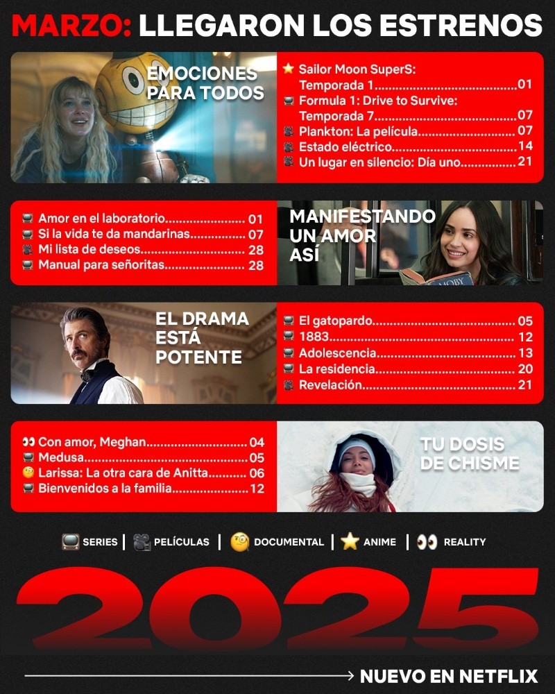 Esta última semana del mes, Netflix tiene preparado un catálogo lleno de novedades para todos los gustos, del 25 al 30 de marzo, podrás disfrutar de nuevos lanzamientos que incluyen emocionantes películas y series.Ya sea que busques drama, comedia, acción o algo más, ¡estos días la plataforma tiene algo especial para ti! Prepárate para maratonear con los mejores estrenos y sumergirte en historias que no te querrás perder.Esta semana en las películas destaca el “Mi lista de deseos” que llega a Netflix el próximo 28 de marzo, protagonizada por la talentosa Sofia Carson, narra la historia de Alex , quien envía a su hija Rose en una misión especial, nunca imagina que este viaje transformará su vida, su tarea consiste en cumplir la lista de sueños de la infancia que alguna vez deseó con ansias vivir. A medida que enfrenta desafíos como una noche de micrófono abierto en un club de comedia y dar clases en un refugio para mujeres, Rose descubre secretos familiares guardados, vive un romance inesperado y se conecta más que nunca consigo misma.Además, ese mismo día también se estrena, la esperada serie “Manual para señoritas” en donde Elena Bianda, una prestigiosa dama de compañía conocida por su destreza para ayudar a jóvenes a conseguir matrimonios ventajosos, se enfrenta a un desafío singular cuando llega al hogar de la familia Mencía, donde deberá encargarse de tres hermanas con personalidades muy diferentes entre sí.NA