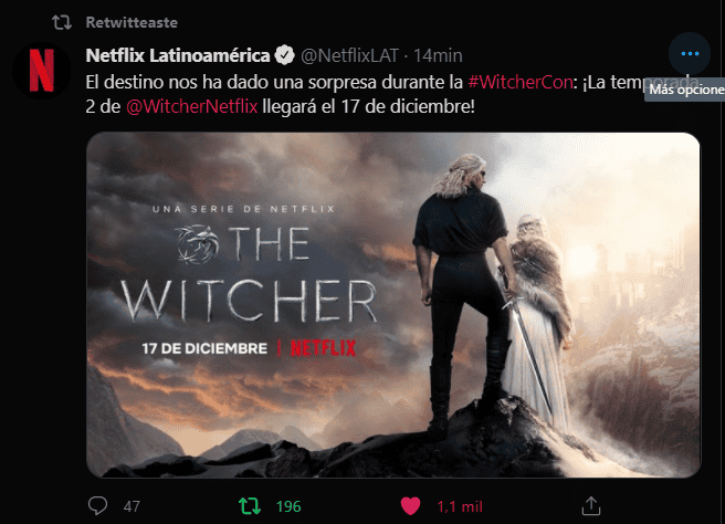La segunda temporada de “The Witcher” al fin tiene fecha de estreno, gracias a que Netflix dio a conocer este viernes que la serie llegará el 17 de diciembre.De acuerdo con la plataforma de Netflix, que reveló novedades de la serie protagonizada por Henry Cavill en el WithcerCon, esta sorpresa alegrará a los fans de la franquicia inspirada en los videojuegosAdemás de la segunda entrega de “The Witcher”, Netflix prepara un spin-off de la serie con “Nightmare of the Wolf”, una película animada que contará una historia previa a los acontecimientos de la serie. Asimismo, habrá otra precuela que será dividida en seis partes con “The Witcher: Blood Origin”, ambientada mil 200 años antes del mundo que ya conocemos de la serie.El rodaje de “The Witcher 2” terminó en abril de este año donde Cavill regresó como “Geralt de Rivia”. De acuerdo con la plataforma de streaming, la serie se produjo en Reino Unido y esta semana tendrá más novedades para sus fans.AC