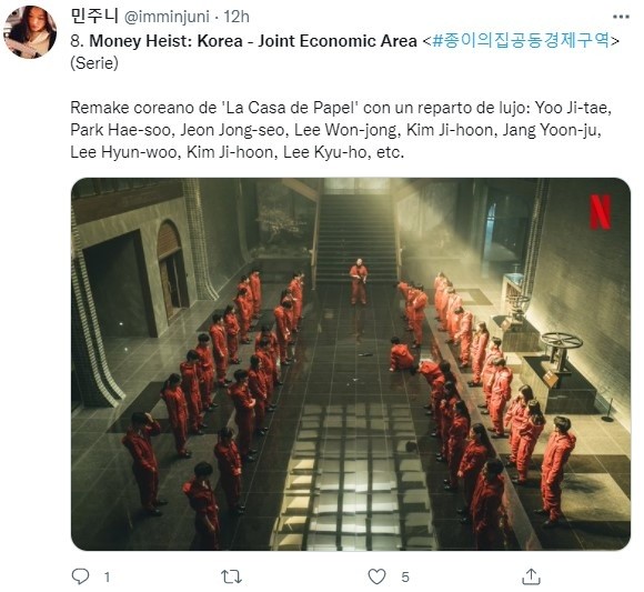 Si eres de los que se quedaron con ganas de ver más de "La casa de papel", ya se encuentra disponible el trailer de "Money Heist: Korea - Joint Economic Area" la versión coreana de la aclamada serie, cuya fecha de estreno en este 2022 está por definirse.En una toma donde está el Profesor (Yoo Ji-tae) de espaldas recargado en una mesa, mientras la cámara se acerca lentamente y en una de las paredes se alcanza a ver una serie de máscaras colgadas, donde se encuentra la ya conocida máscara de Salvador Dalí, es como inicia este trailer que revela el elenco de este "remake".La gente volverá a ver a Park Hae-soo, que alcanzó la fama por su actuación en la serie "El juego del calamar", quien dará vida a Berlín, también está Jeon Jong-seo como Tokio, Lee Won-jong como Moscú, Kim Jin-hun como Denver, Jang Yoon-jun como Nairobi, Park Jung-woo como Río, Kim Ji-Hun como Helsinki y Lee Kyu-ho será Oslo.Este proyecto que tardó dos años en gestarse, fue adaptado por Ryu Yong-jae, quien realizó cambios a la historia para hacerla más cercana al contexto asiático, y Kim Hong-sun dirigió los 12 episodios que componen la primera temporada.AF