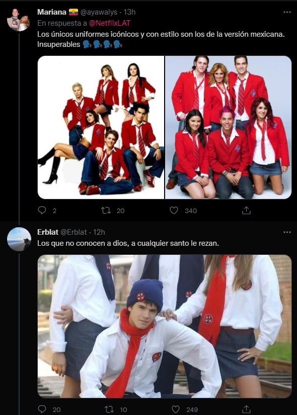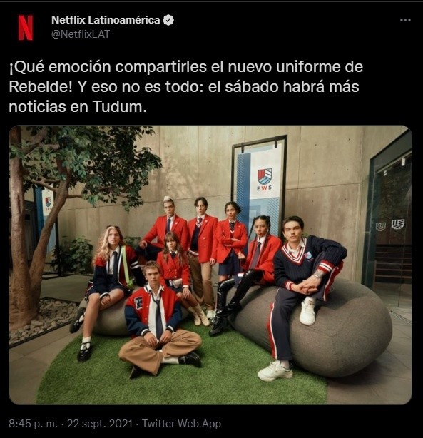 El pasado mes de marzo Netflix dio a conocer que una nueva versión de la telenovela "Rebelde" —próxima a estrenarse en 2022— con un nuevo elenco, y también los actores lucirán uniformes nuevos.A través de una fotografía que Netflix subió a sus redes sociales se puede ver el primer avance de la producción en la que participan Sergio Mayer Mori (hijo de Bárbara Mori) y Andrea Chaparro (hija del comediante Omar Chaparro), Azul Guaita, entre otros.En la foto se ve a ocho integrantes del elenco luciendo diferentes versiones del uniforme nuevo. Mientras los hombres usan saco rojo y pantalón beige, las mujeres portan el mismo saco y falda azul, mientras que el hijo de Sergio Mayer destaca con uniforme en color azul y tenis."¡Sorpresa! ¡Qué emoción compartirles el nuevo uniforme de Rebelde! Y eso no es todo: el sábado habrá más noticias en Tudum", se lee al pie de foto ompartida por Netflix.TUDUM será un evento global virtual para fans de Netflix que se realizará este 25 de septiembre con estrellas y creadores de todo el mundo.Ya en el mes de marzo, Pedro Damián, quien produjo la versión mexicana de la telenovela argentina, que realizó Televisa entre 2004 y 2006, adelantó que la nueva producción se basa en la original y no en la que en México protagonizaron Alfonso Herrera, Dulce María y Maite Perroni, entre otros. Pero además contó que tendrá las canciones que él hizo.Las respuestas en redes por la publicación de esta noche son variadas, muchas de ellas negativas. Hay quienes dicen que prefieren a los RBD de los años 2000 y sus uniformes de aquel entonces, otros han compartido "memes" de "Mía Colucci" (personaje que interpretó Anahí) con cierto aspecto de desprecio.***Si te interesó esta noticia y quieres saber más, entonces descarga y descubre INFORMAPlus, la aplicación digital de EL INFORMADOR, en donde tenemos contenidos exclusivos, seleccionados por nuestros editores, para darles una experiencia más completa a los lectores.Descarga la aplicación y pruébala GRATIS por treinta días.Para iOS: https://apple.co/35jaVgbPara Android: https://bit.ly/3gwVSEVSi eres suscriptor de EL INFORMADOR tu acceso está incluido, solicítalo al 33 3678-7777AC