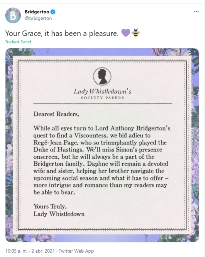 Este viernes, Netflix dio a conocer que el actor Regé-Jean Page no volverá para la segunda temporada de la serie ''Bridgerton".En una carta publicada en la cuenta de Twitter de la serie se explica que el arco del personaje que Regé-Jean Page interpretaba, el ''duque de Hastings'', terminó en la primera temporada y prácticamente no tiene participación, además, se pretende respetar el contenido original de los libros.''Queridos lectores. Mientras todos los ojos se vuelven hacia la búsqueda de Lord Anthony Bridgerton para encontrar una vizcondesa, nos despedimos de Regé-Jean Page, quien interpretó triunfalmente al duque de Hastings. Extrañaremos la presencia de Simon en la pantalla, pero siempre será parte de la familia Bridgerton. Daphne seguirá siendo una esposa y una hermana devotas, que ayudará a su hermano a navegar la próxima temporada social y lo que tiene para ofrecer: más intriga y romance de lo que mis lectores pueden soportar. Atentamente, Lady Whistledown'', dice el texto. Netflix aseguró que ''Bridgerton", éxito televisivo de Shonda Rhimes, es la serie más vista en la historia de la plataforma. En un comunicado indicó que 82 millones de cuentas vieron el trabajo en sus primeros 28 días tras su estreno en Navidad de 2020.''Bridgerton" cuenta la historia de ''Daphne Bridgerton'' (Phoebe Dynevor), la hija mayor de la familia Bridgerton, y su presentación en sociedad en el competitivo mercado matrimonial de Londres durante el periodo de la Regencia.''Daphne'', deseosa de encontrar el verdadero amor como lo hicieron sus padres, parece tener las mejores oportunidades. Sin embargo, a medida que su hermano mayor empieza a descartar a sus posibles pretendientes, la publicación escandalosa de la misteriosa ''Lady Whistledown'' genera serias dudas sobre su persona en la alta sociedad londinense. Es entonces que aparece el duque de ''Hastings'' (Regé-Jean Page), un soltero empedernido y rebelde, además del sueño de todas las madres de debutantes. OF