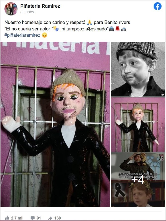 La reciente creación de la Piñatería Ramírez, que decidió sacar a la venta la figura del actor Octavio Ocaña, quien perdiera la vida el pasado 29 de octubre, ha ocasionado diversos comentarios en redes sociales.La piñata de "Benito Rivers", como era conocido el actor en la serie "Vecinos", se exhibe ya en la piñatería que anteriormente creó las figuras de Donald Trump, Thalía y muchas otras que han trascendido fronteras.Para algunos usuarios de redes sociales no ha resultado agradable el que la piñatería sacara esta figura luego de la trágica muerte del actor.Aunque en sus cuentas de redes sociales la piñatería asegura que la figura se creó como homenaje a Octavio Ocaña, una gran cantidad de usuarios de redes sociales han alzado la voz pues aseguran que la piñata es una falta de respeto para la familia del actor.En su publicación, la piñatería escribió lo siguiente acompañando las fotografías: "Nuestro homenaje con cariño y respeto para Benito Rivers. El no quería ser actor, ni tampoco asesinado", escribieron.JM