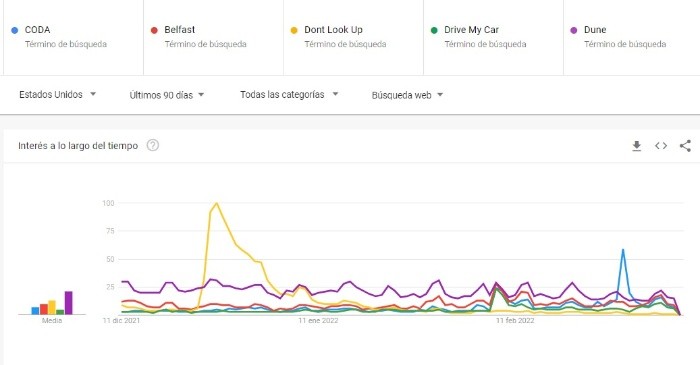 Poco a poco se acerca el gran día de la ceremonia de los Premios Oscar 2022 y la popularidad de algunas películas han incrementado considerablemente desde el anuncio de las nominaciones.Este interés por parte del público podría dar algunas pistas de cuál sería la película que se lleve el mayor premio a la Mejor Película. De acuerdo con datos de Just Watch, la película “King Richard” —protagonizada por Will Smith— lidera la popularidad en las transmisiones por streaming. En comparación con la semana pasada, “Belfast” disminuyó su popularidad hasta el tercer lugar; mientras que “CODA” —con Eugenio Derbez— se mantuvo en la segunda posición.El resto de la lista lo completan “El Poder del Perro”, “Dune”, “El Callejón de las Almas Perdidas” y “No miren arriba”.En INFORMADOR.MX consultamos los datos de Google Trends, herramienta de la compañía estadounidense que mide las búsquedas de sus usuarios en el buscador en tiempo real, hasta este día, son las películas “Don´t Look Up” y “the Power of the dog” las que se mantienen como la más populares en Estados Unidos. Incluso, la recién estrenada en Disney+ “West Side Story” podría sorprender.Para los mexicanos, se trata de “CODA” la que se ha colocado como la favorita entre los cinéfilos, por encima de “El Callejón de las Almas Perdidas” y “El Poder del Perro”.La ceremonia de los Premios Oscar se llevará a cabo el próximo domingo 27 de marzo.AC