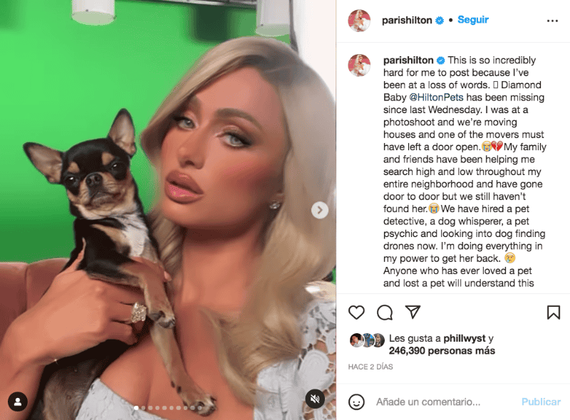 ¿Qué harías por encontrar a tu mascota? La empresaria y socialité Paris Hilton es muestra de que se puede emplear más de un recurso para localizar a un cachorro cuando se tiene cariño y los medios para hacerlo: Hilton ha pedido ayuda a sus seguidores pues su chihuahua, Diamond Baby, ha desaparecido."Es increíblemente difícil para mí publicar esto porque no tengo palabras. Diamond Baby lleva desaparecido desde el pasado miércoles", comunicó. La heredera detalló que estaba simultáneamente en una sesión de fotos y en mudanza cuando su perro se extravió, por lo que uno de los responsables del traslado de sus muebles habría dejado la puerta abierta, facilitando la huida del can.Tanto ella como su familia y amigos están ayudando en esta búsqueda; sin embargo, los Hilton han decidido agotar hasta el último recurso posible para dar con la mascota, prueba de ello lo asegura la otra parte del comunicado:"Hemos contratado a un detective de mascotas, un susurrador de perros, un médium de animales y ahora estoy intentando usar un dron especializado", informó una muy determinada Paris Hilton.Finalmente la empresaria apela a cualquier persona que haya querido y perdido a una mascota: “Mi corazón está roto", expresó.También dedicó una de sus cuentas, la que utiliza para compartir imágenes de sus mascotas y tiene más de 80 mil seguidores, para encontrar al perrito.Diamond Baby no es el único perro de Paris Hilton, de hecho tiene otros seis, Slivington (pomerania y husky siberiano), Prince, Princess, Crypto y Cutesie Hilton y Ether Reum (cuatro mini pomeranias). Pero el cariño que Paris Hilton profesa a cada uno de sus canes luce auténtico: ella se traslada y carga con sus mascotas a todas partes, al tiempo que y combina delicadamente sus atuendos. Incluso tiene una pequeña mansión en el jardín de su casa para ellos, misma que cuenta con aire acondicionado, muebles de diseñador y otras amenidades.Y el pequeño Diamond Baby, un chihuahua negro y marrón, con un lugar tan especial en la vida de Hilton, que incluso la acompaño el día de su boda.AD