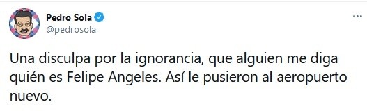 Pedro Sola utilizó sus redes sociales para pedir ayuda en una duda histórica y se ganó las críticas de cientos de usuarios que lo señalaron de ignorante.El conductor del programa de televisión "Ventaneando" afirmó no saber quién es el héroe de la Revolución Mexicana Felipe Ángeles, quien luchó junto al general Francisco Villa. La pregunta surgió luego de que se nombrara así al nuevo aeropuerto internacional del país ubicado en Santa Lucía."Una disculpa por la ignorancia, que alguien me diga quién es Felipe Ángeles. Así le pusieron al aeropuerto nuevo", escribió Sola en Twitter.En este aeropuerto, el día de ayer el presidente López Obrador inauguró la Base Aérea Militar número 1 y conmemoró el Día de la lealtad. Felipe Ángeles también fue director del Colegio Militar en 1912, nombrado por Francisco I Madero y comandante de la artillería de la División del norte.La publicación se hizo controversial pues entre los usuarios de la plataforma hubo quienes lo acusaban de ignorante y flojo por no investigar antes de publicar, pero también los que lo defendieron, argumentando que tenía derecho a tener preguntas y que sólo estaba pidiendo ayuda.El historiador Pedro Salmerón fue uno de los cibernautas que lo cuestionó.Incluso algunos usuarios empatizaron con Sola, y aceptaban que en la educación básica no siempre se enseñaba acerca del General Ángeles. Destacó el comentario del historiador Pedro Salmerón Sanginés, quien quedó sorprendido con la pregunta y generó un nuevo debate.Pedro Sola es licenciado en economía por la UNAM y trabajó en la Secretaría de Hacienda en 1968. Algunos justificaron su ignorancia aludiendo a su carrera.jb