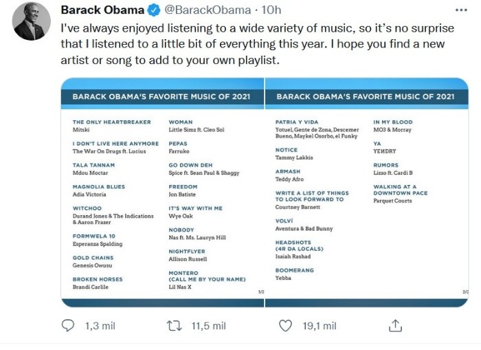 "Pepa y agua pa' la seca / To' el mundo en pastilla' en la discoteca" es el coro de la canción "Pepas", del reggaetonero Farruko, tema que forma parte de las canciones preferidas del expresidente Barack Obama en este 2021.Como ya es tradición, Obama comparte en sus redes sociales el listado de sus libros, películas y canciones preferidas cada año.En esta ocasión, hay tres temas latinos: "Pepas", de Farruko; "Volví", de Aventura y Bad Bunny, y “Patria y vida”, de Yotuel, Gente de Zona, Descemer Bueno, Maykel Osorbo y el Funky."Patria y vida" es un tema político, considerado ya un himno de los que piden un cambio en Cuba.JM