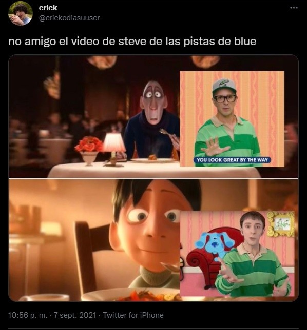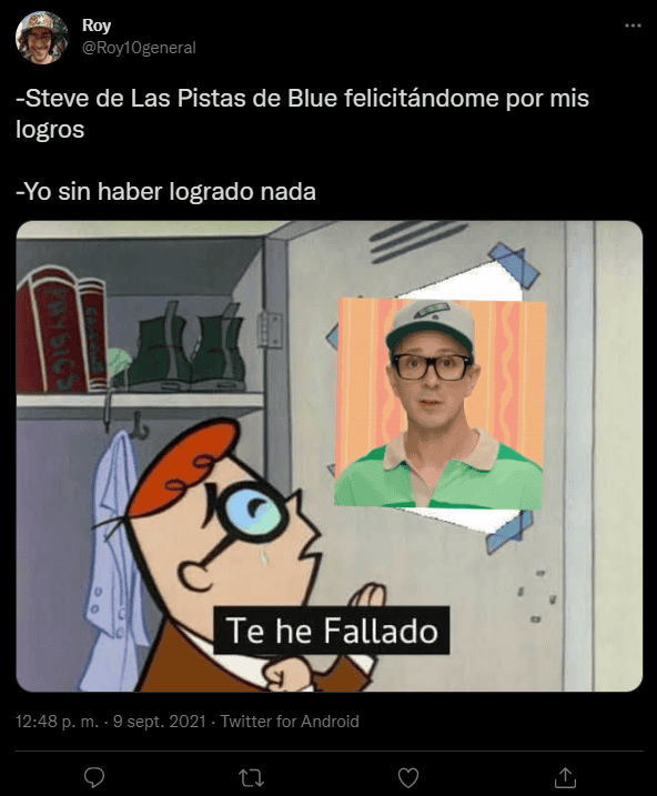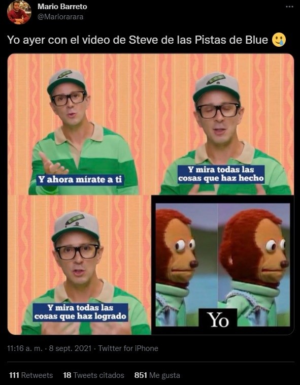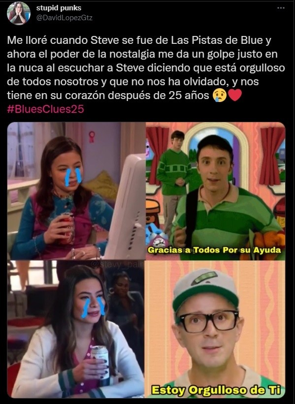 Luego del emotivo video de la reaparición de Steve de "Pistas de Blue", muchos internautas quedaron encantados y un tanto melancólicos por el mensaje, sin embargo, otros más no perdieron la oportunidad de compartir memes y reacciones para alegrar un poco el momento.Varias de las reacciones al mensaje de Steve por el aniversario de "Pistas de Blue" hicieron alución a una de las frase que el conductor dijo. "Mírense ustedes, todo lo que han hecho y lo que han logrado en todo este tiempo".Esto provocó que muchos se preguntaran si de verdad habían logrado algo desde que inició "Pistas de Blue" hasta esta reaparición de nuestro amigo Steve.Algo que no cabe duda, es que el video alegró a muchísimos internautas, quienes compartieron el post y reaccionaron con “me encanta” en Facebook, mismo donde ha logró más de 25 millones de reproducciones en sus primeras horas.“Las Pistas de Blue” se transmitió por Nickelodeon desde 1995 durante 6 temporadas. Actualmente se puede disfrutar de la serie infantil en Amazon Prime Video.***Si te interesó esta noticia y quieres saber más, entonces descarga y descubre INFORMAPlus, la aplicación digital de EL INFORMADOR, en donde tenemos contenidos exclusivos, seleccionados por nuestros editores, para darles una experiencia más completa a los lectores.Descarga la aplicación y pruébala GRATIS por treinta días.Para iOS: https://apple.co/35jaVgbPara Android: https://bit.ly/3gwVSEVSi eres suscriptor de EL INFORMADOR tu acceso está incluido, solicítalo al 33 3678-7777AC