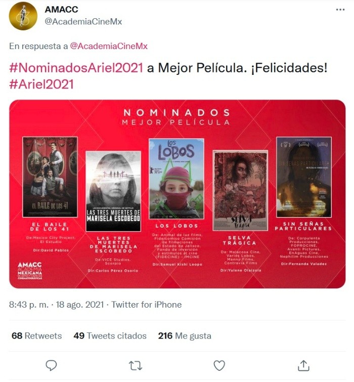 La Academia Mexicana de Artes y Ciencias Cinematográficas (AMACC) presentó la noche de este miércoles a los nominados de la edición 63 del premio Ariel de Plata, que el próximo sábado 25 de septiembre realizará la entrega a sus galardonados desde la Ciudad de México como sede y con transmisión en televisión abierta y redes sociales.La actriz Ana Valeria Becerril y el actor Benny Emmanuel fueron los responsables de presentar al talento nominado en las diversas categorías, a las cuales se inscribieron 129 películas, de las cuales 58 son largometrajes (42 de ficción, 13 de documental y tres de animación), 60 cortometrajes (40 de ficción, 15 de documental y cinco de animación) y 11 iberoamericanas de Argentina, Brasil, Colombia, Chile, Ecuador, España, Guatemala, Paraguay, Portugal, República Dominicana y Venezuela. Como cada año, también se entregará el Ariel de Oro, que en esta ocasión será para la primera actriz Ofelia Medina por su trayectoria y para el sonidista Fernando Cámara.Entre los filmes que lideran las nominaciones está el jalisciense “Los Lobos”, dirigido por Samuel Kishi Leopo, que competirá por las categorías de mejor actriz, co-acutuación femenina, dirección, diseño de arte, edición, fotografía, guion original, música original, doble nominación en revelación actoral, sonido, vestuario y mejor película.Otra de las películas con más nominaciones es “Selva Trágica” de Yulene Olaizola con 12 nominaciones, así como el documental “Las tres muertes de Marisela Escobedo” con siete posibilidades de galardón.En total son 44 de películas nominadas, de las cuales 15 son cortometrajes y 29 son largometrajes, en tanto que 49 mujeres fueron nominadas y 92 hombres nominados*Mejor Revelación Actoral: Ana Laura Rodríguez por “Sin señas particulares”, Indira Andrewin por “Selva Trágica”, Juan Jesús Varela por “Sin señas particulares”, Leonardo Nájar Márquez por “Los lobos” y Maximiliano Nájar Márquez por “Los lobos”.*Mejor Largometraje Documental: “Cosas que no hacemos” de Bruno Santamaría Razo, “La vocera” de Luciana Kaplan, “Las tres muertes de Marisela Escobedo” de Carlos Pérez Osorio, “Volverte a ver” de Carolina Corral y “Yermo” de Everardo González.*Mejor actriz: Mabel Cadena por “El baile de los 41”, Martha Reyes por “Los Lobos”, Mercedes Hernández por “Sin señas particulares”, Mónica del Carmen por “Nuevo Orden” y Naian González Norvind por “Leona”.*Mejor actor: Alfonso Herrera por “El baile de los 41”, Armando Espitia por “Te llevo conmigo”, Demián Bichir por “Danyka”, Fernando Cuautle por “Nuevo Orden”, Juan Pablo Medina por “El club de los idealistas” y Lázaro Gabino Rodríguez por “Fauna”.*Mejor Dirección: “Las tres muertes de Marisela Escobedo” de Carlos Pérez Osorio, “El baile de los 41” de David Pablos, “Sin señas particulares” de Fernanda Valadez, “Los lobos” de Samuel Kishi Leopo y “Selva Trágica” de Yulene Olaizola.*Mejor Película: “El baile de los 41” dirigida por David Pablos, “Las tres muertes de Marisela Escobedo” dirigida por Carlos Pérez Osorio, “Los lobos” dirigida por Samuel Kishi Leopo”, “Selva Trágica” dirigida por Yulene Olaizola y “Sin señas particulares” dirigida por Fernanda Valadez.*Co-actuación femenina: Carolina Politi por “Leona”, Cici Lau por “Los Lobos”, Margarita Sanz por Leona”, Michelle Rodríguez por “Te llevo conmigo” y Nailea Norvind por “El club de los idealistas”.*Mejor co-actuación masculina: Christian Vázquez por “Te llevo conmigo”, David Illescas por “Sin señas particulares”, Eligio Meléndez por “Nuevo Orden”, Emiliano Zurita por “El baile de los 41” y Lázaro Gabino Rodríguez por “Selva Trágica”.*Mejor música original: “Selva Trágica” por Alejandro Otaola, “El baile de los 41” por Carlos Ayhllón y Andrea Balency-Béarn, “Sin señas particulares” por Clarice Jensen, “Leona” por Jacobo Lieberman y “Los lobos” por Kenji Kishi Leopo.*Mejor sonido: “Las tres muertes de Marisela Escobedo” de Alejandro de Icaza, Enrique Fernández y Víctor Benítez; “Selva Trágica” de José Miguel Enríquez Rivaud, Federico González, Jaime Baksht y Michelle Couttolen; “Los Lobos” de Mario Martínez Cobos, Carlos García y Miguel Hernández; “Sin señas particulares” de Omar Juárez, Milton Aceves, Alejandro Mayorquín y Misale Hernández “Topillo”, y “Nuevo Orden” de Raúl Locatelli, Alejandro de Icaza, Jaime Baksht y Michelle Couttolenc.*Mejor cortometraje documental: “Boca de culebra” de Adriana Otero, “Están en algún sitio” de Pablo Tamez, “La felicidad en la que vivo” de Carlos Morales y “No seré la vida de mi recuerdo” de Isabela Ripoll.*Mejor cortometraje de ficción: “Arreglo Napolitano” de Rodrigo Ruiz, “Asoleadas” de Nadia Ayala, “Bisho” de Pablo Giles, “El día que comenzó ayer” de Julián Hernández y “Wheels” de Roberto Feisco.*Mejor Cortometraje de Animación: “A la cabeza” de Andrea Santiago, “El desfile de los ausentes” de Marcos Almada Rivero, “La casa de la memoria” de Sofía Rosales Arreola, “Un juguete de madera soñó con barco de papel” de Mauricio Hernández Serrano y “Un peluche espacial” de Jesús Sebastián y Jaime Oviedo.*Mejor vestuario: “Nuevo Orden” de Gabriela Fernández, “El baile de los 41” de Kika López, “Los Lobos” de Nohemi González, “Selva Trágica” de Samuel Conde y “Leona” de Ximena Guzmán.*Mejor maquillaje: “Nuevo orden” de Adam Zoller, “El baile de los 41” de Alfredo “Tigre” Mora, “Selva Trágica” de Gerardo Muñoz, “Sin señas particulares” de Neftalí Zamora y Tania Larizza y “Rencor tatuado” de Vladimir Amok.*Mejor Diseño de Arte: “Nuevo orden” de Claudio Ramírez Castelli, “Sin señas particulares” de Dalia Reyes, 