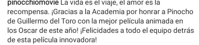 Emily Blunt y Dwayne Johnson mencionaron el nombre de "Pinocho" como la Mejor Película Animada del año y la reacción del tapatío Guillero del Toro llamó la atención, pues se le vio sereno y sin nervios.Desde su estreno, la cinta de Guillermo del Toro se convirtió en la favorita del público y su triunfo en la gala de esta noche era ya casi una predicción.Durante su discurso de agradecimiento, el cineasta mexicano agradeció a su familia y a Netflix por la oportunidad de llevar a cabo el que se ha convertido en su proyecto más importante y, además, pidió a todos los televidentes, así como los asistentes, seguir apoyando al género de la animación.Por su parte, en las redes sociales, Del Toro también compartió un mensaje para celebrar su triunfo junto a todas las personas que trabajaron con él: "La vida es el viaje, el amor es la recompensa. ¡Gracias a la Academia por honrar a 'Pinocho' con la Mejor Película Animada en los Oscar de este año! ¡Felicitaciones a todo el equipo detrás de esta película innovadora!", escribió en su cuenta oficial de Instagram.Como era de esperarse las reacciones de los usuarios inundaron la publicación y le expresaron su orgullo, su cariño y su apoyo a quien se ha convertido en todo un héroe para el cine mexicano."Todos estamos llorando de felicidad", "Te amo Guillermo", "El mejor de los mejores. Lo amo señor Guillermo del Toro", "De Guadalajara para el mundo", "¡Viva México, Viva Jalisco!", "Una de las películas más bellas que he visto. Me abrazó cuando más lo necesitaba. Merecido", "Ganó el cine", son sólo algunos de los comentarios que se pueden leer.Cabe destacar que este Oscar se convierte en la tercera estatuilla que el mexicano ha ganado a lo largo de su trayectoria, anteriormente ganó Mejor Película y Mejor Director por "La forma del agua".