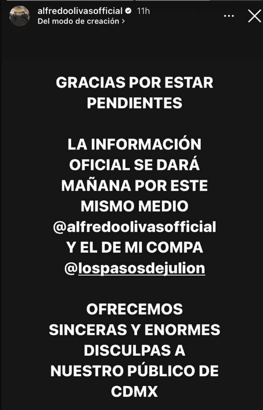 Los reconocidos y populares cantantes de música regional mexicana, Julión Álvarez y Alfredo Olivas, causaron revuelo al anunciar su gira conjunta “Prófugos del Anexo” misma que tendría un concierto en la Ciudad de México, pero que ha sembrado las dudas a causa de varias inconsistencias. Olivas anunció en sus redes sociales que los conciertos en la CDMX se realizarían los días 20 y 21 de julio de 2024, pero no comentó nada acerca de la sede del evento. Se especuló que sería en el Campo Marte, propiedad de la Sedena, pero el ente estatal aseguró que no existían los permisos para tocar ahí y que la información era falsa. Banorte había confirmado la preventa de boletos para el 15 y 16 de mayo de 2024, sin embargo, ante la ausencia de confirmación del organizador acerca de la sede, el banco anunció que la preventa sería cancelada hasta nuevo aviso. Del mismo modo, la organización de la gira confirmó la información en las redes sociales, asegurando que cualquier información del evento se daría a conocer en sus redes sociales, las de Julión Álvarez y las de Alfredo Olivas. De momento no se sabe qué sucederá con los conciertos, esperando una respuesta por parte de los promotores para encontrar un recinto adecuado para un concierto que será histórico en el mundo de la música regional mexicana.Recuerda seguir solamente la información oficial y evitar creer y difundir rumores de otros medios para evitar fraudes y estafas. ***Mantente al día con las noticias, únete a nuestro canal oficial de WhatsAppFA