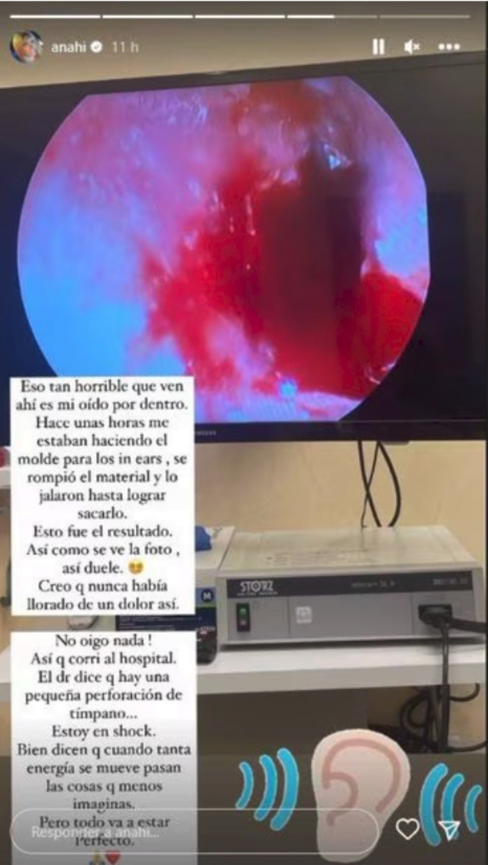 Anahí la está pasando mal por un incidente que la llevó corriendo al hospital, la cantante, que se alista para empezar la gira mundial con RBD, sufrió un accidente que le lastimó el oído y que la mantiene sin escuchar nada y en shock, así lo relató en sus redes sociales, donde contó el susto que padeció.La cantante de 40 años se alista para arrancar lo que será su regreso a los escenarios junto a sus compañeros de RBD, agrupación que saltó a la fama en 2004 a raíz de la telenovela "Rebelde", producida por Pedro Damián y la cual fue protagonizada por Anahí, Dulce María, Maite Perroni, Alfonso Herrera, Christopher Uckermann y Christian Chávez, los mismos que integran la banda musical, con excepción de Poncho, quien no se sumará a la gira musical "Soy Rebelde Tour".RBD ha agotado las entradas de los más de 30 conciertos que tiene previsto dar a partir del 25 de agosto, el tour, convocado tras 15 años fuera de los escenarios, los llevará desde Nueva York, Chicago, Miami y Las Vegas hasta Medellín, Sao Paulo y Río de Janeiro. El tramo final de la gira será en su México natal, con actuaciones en Monterrey, Guadalajara y Ciudad de México, donde darán el concierto final el 17 de diciembre.La cantante Anahí contó que mientras le estaban haciendo el molde para los audífonos, el material se rompió y tuvieron que jalarlo hasta sacarlo; el resultado fue una perforación en el tímpano que hasta el momento no permite escuchar a la cantante, así lo explicó en sus redes, donde mostró una imagen de la perforación que sufrió su tímpano."Eso tan horrible que ven ahí es mi oído por dentro", escribió en la publicación, donde comentó que "así como se ve en la foto, así duele, creo que nunca había llorado de un dolor así".Anahí confesó que está en shock, corrió al hospital y ahí el doctor le mostró lo que había ocurrido: "Bien dicen que cuando tanta energía se mueve pasan las cosas que menos imaginas, pero todo va a estar perfecto", expresó con ánimo, confiando en que se recuperará pronto.vll