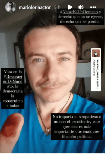 Son pocos los famosos que han hablado en sus redes sociales sobre la revocación de mandato que se llevó a cabo este domingo 10 de abril en la Ciudad de México.En este ejercicio participativo, los ciudadanos pudieron elegir entre manifestar su apoyo al mandatario actual del país, Andrés Manuel López Obrador (AMLO), para que termine su sexenio o, determinar la conclusión anticipada de su destitución por pérdida de confianza.Aunque en días pasados algunas personalidades como Eugenio Derbez, Bárbara Mori, Ivanna de María y Rubén Albarrán se manifestaron en contra de la construcción del Tren Maya, orquestado por AMLO; en esta ocasión ninguno se ha pronunciado al respecto de la votación.Hay quienes han demostrado su desacuerdo con el gobierno actual como Chumel Torres, que con respecto a la actividad política de hoy destacó la falta de participación ciudadana, con la frase: "Fue más gente a ver a Coldplay que a la mensada esa de la Revocación".Mientras que Odyn Duperyron publicó la noche anterior que no estaba interesado en ser parte de la votación. "Ya me urge no ir a votar mañana", escribió el conferencista.Algunos otros como Regina Orozco y Damián Alcazar apoyaron abiertamente al actual gobierno, autodenominado 'Cuarta transformación'."¿Sí saben que tenemos un Presidente que está intentando acabar con la corrupción en México?", preguntó Alcázar en un video en el que exhorta a votar en favor de AMLO con el hashtag #TodosALaCalle.Por su parte, Regina se tomó una fotografía después de votar en una casilla especial desde Puerto Vallarta, donde actualmente está trabajando."No hay pretexto para no participar en la revocación de mandato", dijo la soprano.Otra que compartió su participación fue Eugenia León quien se limitó a escribir "¡Listo, hemos cumplido!", en una imagen en la que se le ve junto a su hijo Eugenio, de 24 años.De la misma manera el actor de la serie "Monarca", Mario Loría presumió su voto, pero se mostró imparcial."No importa si simpatizas o no con el Presidente, este ejercicio es más importante que cualquier filiación política", escribió Loría en Instagram.MF