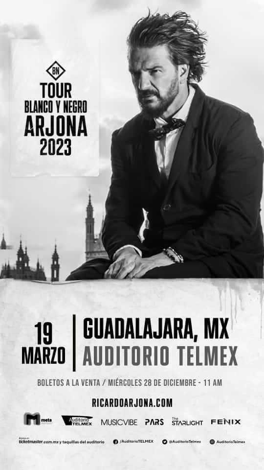 El cantautor guatemalteco, Ricardo Arjona, regresa a México para presentar de nueva cuenta su gira “Blanco y Negro Tour”.El 2022 fue un año lleno de éxito para el artista gracias a esta gira en la que se encuentra presentando su más reciente material así como su largo repertorio con sus temas más emblemáticos, con los cuales ha logrado agotar los boletos para más de 100 shows en distintas ciudades.Para complacer a sus fans tapatíos, Ricardo Arjona vuelve en 2023, anunciando una nueva fecha el 19 de marzo en el Auditorio Telmex.Los boletos estarán a la venta al público en general el miércoles 28 de diciembre a partir de las 11:00 horas a través de Ticket Master con precios a partir de los 690 pesos.“Mientras todos buscaron un lugar cercano a las modas y a lo que establecía el sonido de la radio y las plataformas digitales, bajo el lema ‘díganme qué hay que hacer para no hacerlo’, Arjona se aventuró a la producción de 24 canciones en los icónicos estudios Abbey Road, intentando contradecir todo lo que existía en la música en castellano y aferrándose más que nunca a lo que sabía hacer”, expresa el comunicado de prensa.“Una vez más, este solitario de la industria e independiente desde hace más de 12 años, escogió su propio camino. El resto, decidieron parecerse un poco a lo que estaba pasando o insistir en colaboraciones para intentar salir a flote en un mundo hispanoamericano en el que hoy en día parece que sólo existe un tipo de música”, reitera dicho comunicado.“Blanco y Negro”, su álbum, fue grabado en vivo, sin rebuscamientos tecnológicos, con instrumentos y equipos de los años 60.“Habiendo cruzado la barrera de las más de 105 fechas completamente agotadas en Europa, Norteamérica y Sudamérica, 'Blanco y Negro Tour' se consolida con más de un millón y medio de personas que han podido disfrutar este espectáculo durante este año”.No pierdas la oportunidad de vivir la experiencia, y si ya fuiste, de revivirla. MS