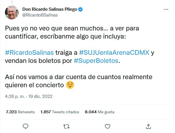 El empresario Ricardo Salinas Pliego lanzó un concurso en Twitter para traer a la banda coreana Super Junior a la Arena CDMX, luego de que una usuaria lanzara la petición.Por medio de la red social, la usuaria @PinkMagicCloud pidió al magnate mexicano traer a la banda."@RicardoBSalinas por favor interfiera para que @SJofficial llegue a la arena CDMX, le daremos nuestros dineros!!!", se lee en el tuit.Ante ello, el fundador de Grupo Salinas pidió saber más acerca del grupo para considerar ayudar. "A ver… de que se trata, dígame, la escucho y si puedo le ayudo".Sin embargo, al no recibir tanta respuesta, el dueño de Elektra creo un hashtag para sumar un número de fanáticos de la banda y poder hacer realidad la petición. "Pues yo no veo que sean muchos… a ver para cuantificar, escríbanme algo que incluya: #RicardoSalinas traiga a #SUJUenlaArenaCDMX y vendan los boletos por #SuperBoletos. Así nos vamos a dar cuenta de cuantos realmente quieren el concierto", explicó.Ya me están convenciendo, dice Salinas PliegoAsimismo, anunció la cantidad de RT que se habían logrado. "Van 1130 RT a ver si es cierto que llenarían la Arena CDMX, me están convenciendo...".Finalmente, el dueño de TV Azteca preguntó a su hijo y a otras tres cuentas de Twitter sobre la posibilidad de hacer realidad el sueño de los jóvenes. "No pues ya me están convenciendo… como ves @SalinasBenjamin, @ArenaCdMexico, @lucianopascoe, @Rafa_RodriguezS… ¿podremos hacer algo por los jóvenes?".vll