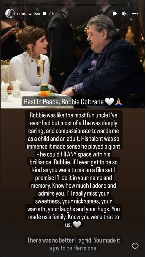 Actores de la exitosa saga de Harry Potter despidieron a Robbie Coltrane, el artista que interpretó al guardabosques "Rubeus Hagrid", luego de que se diera a conocer su fallecimiento a los 72 años.Coltrane, cuyo nombre real era Anthony Robert McMillan, murió este viernes, en el hospital Forth Valley Royal de Larbret en Escocia, según su agente Belinda Wright. Se desconocen las causas de la muerte."Robbie era una de las personas más divertidas que he conocido y nos hacía reír todo el tiempo en el rodaje cuando éramos niños", reaccionó Daniel Radcliffe, intérprete que dio vida a "Harry Potter"."Me siento increíblemente afortunado de haberlo conocido y muy triste por su muerte", agregó.Emma Watson, la actriz que encarnó a "Hermione Grange" también le dedicó unas emotivas palabras a Coltrane.A través de su Instagram, la mujer escribió: "Descanse en paz Robbie Coltrane. Robbie era como el tío más divertido que he tenido, pero sobre todo era muy cariñoso y compasivo conmigo tanto de niña como de adulta".Además expresó que Robbie era un artista enormemente talentoso, algo que tenía sentido debido a su gran tamaño."Tenía sentido que interpretara a un gigante: podía llenar cualquier espacio con su brillantez. Robbie, si alguna vez llego a ser tan amable como tú fuiste conmigo en un set de filmación, te prometo que lo haré en tu nombre y en tu memoria. Quiero que sepas cuánto te adoro y te admiro. Extrañaré mucho tu dulzura, tus apodos, tu calidez, tus risas y tus abrazos. Nos hiciste una familia. Quiero que sepas que fuiste eso para nosotros. No había mejor Hagrid. Hiciste que fuera un placer ser Hermione", se leyó.En la cuenta oficial de Twitter del agente 007, los productores de la franquicia Michael G. Wilson y Barbara Broccoli recordaron a Coltrane como "un actor excepcional cuyo talento no tenía límites...""Lo extrañaremos en tanto que amigo. Descansa en paz, Robbie".Tom Felton también se unió a la pena pues recordó los momentos que pasó junto a Coltrane."Uno de mis mejores recuerdos favoritos de filmar Harry Potter fue un rodaje nocturno de la primera película en el bosque prohibido. Tenía 12 años. Robbie se preocupaba y cuidaba a todos los que lo rodeaban. Sin esfuerzo. Y los hizo reír. Sin esfuerzo. Era un gran gigante amistoso en la pantalla, pero aún más en la vida real. Te amo compañero - gracias por todo”, externó.La escritora J. K. Rowling, creadora del universo de Potter, agradeció al actor.Nacido en Rutherglen, cerca de Glasgow, Escocia, el actor era adorado por niños y mayores de todo el mundo por su interpretación del personaje, medio gigante medio humano, amable y algo torpe, que ayuda al joven brujo Harry Potter y sus amigos en sus aventuras en la escuela de brujería de Poudlard.MF