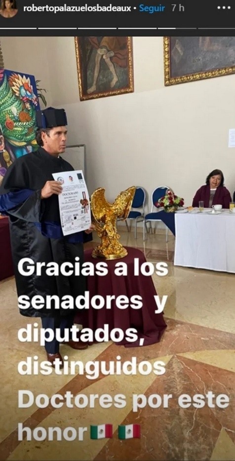 Debido a sus aportes a la actuación y dirección cinematográfica, Roberto Palazuelos fue reconocido con el Doctorado Honoris Causa el miércoles.El actor conocido como "El Diamante negro" compartió la noticia en su cuenta de Instagram acompañada por fotografías donde se ve su título, además de él posando con un birrete."Gracias a los senadores y diputados, distinguidos doctores por este honor", escribió en una historia.El documento destaca además la ética profesional de Palazuelos y el poner en alto el nombre de México con su labor en el mundo del espectáculo.El protagonista del reality "Palazuelos Mi rey" ha participado en telenovelas como "Mañana es para siempre" y en el reality Big Brother VIP, además de tener su propia cadena hotelera.Como se puede leer en el documento, el reconocimiento le fue entregado por parte del Colegio Internacional de Profesionistas C&C.JM