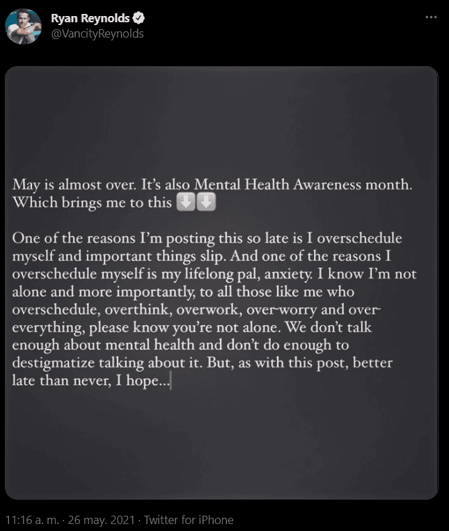 En 2018 Ryan Reynolds habló por primera vez de su "secreto" con The New York Times: "Sufro de ansiedad. Siempre he sido así. He estado en ambos extremos, la ansiedad desenfadada por alguna situación y las oscuras profundidades del otro lado del espectro, lo cual no es nada divertido".Este jueves, en el marco del mes de la Conciencia acerca de la Salud Mental, Ryan Reynolds mandó un mensaje en sus redes sociales: "Ya casi acaba mayo. Lo que me lleva a este mensaje. Una de las razones por las que publico esto tan tarde es porque programo todo y hay cosas importantes que se me escapan. Y una de las razones por la que programo todo es debido a mi amiga de toda la vida: la ansiedad”."Sé que no estoy solo y lo más importante, para todos aquellos que como yo piensan, programan, trabajan o se preocupan demasiado, por favor tienen que saber que no están solos. No hablamos lo suficiente acerca de la salud mental y no hacemos lo suficiente para eliminar el estigma. Pero, como esta publicación, espero que lo logremos mejor tarde que nunca…".Y abundó sobre ello, pues compartió que esta enfermedad, que en la actualidad padecen más de 260 millones de personas en todo el mundo, según la OMS, es algo que también le afecta, llegando incluso a reconocer que sufre ataques de pánico esporádicos, por lo que pidió que se tomen medidas para apoyar a quienes padecen ansiedad.AC