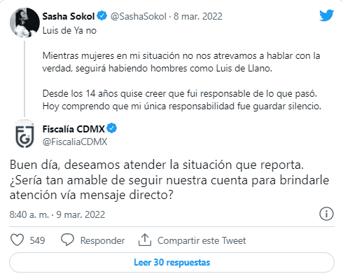 La Fiscalía de la CDMX busca atender la denuncia de abuso que la cantante Sasha Sokol acusó por parte de Luis de Llano, cuando ella tenía 14 años y era miembro de Timbiriche.A través de redes sociales, la Fiscalía de la CDMX dijo que atendería “la situación que reporta” y pidió a Sasha de reportar legalmente su caso.Sasha Sokol acusó esta noche del 8M al productor Luis de Llano de cometer un delito por la relación que tuvieron cuando ella tenía 14 años y el 39.A través de Twitter, Sasha compartió su experiencia durante la relación que tuvo con el productor, quien, aseguró, "desde los 14 años quise creer que fui responsable de lo que pasó. Hoy comprendo que mi única responsabilidad fue guardar silencio".Por ello, mediante un hilo en la red social relató cómo fue la relación que sostuvo con Luis de Llano.La respuesta de Sasha se dio unos días después de que el productor habló del caso. "Sí tuve un romance con Sasha, me enamoré y me mandó al demonio.Tuve un momento en el que convivimos juntos, estuve muy enamorado de ella y un día nada que ver y se acabó y seguimos trabajando 10 años más juntos", dijo.AC