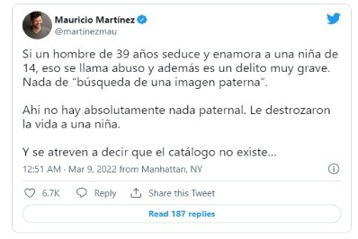 Antonio Berumen, mejor conocido en la industria del entretenimiento en México como “Toño”, fue un productor musical que en los 90 lanzó con éxito a agrupaciones como “Magneto”, “Mercurio” y “Kairo”, entre otros proyectos musicales. Y ahora que Sasha Sokol habló de su historia de abuso por parte del también productor Luis de Llano, el actor y cantante Mauricio Martínez se solidarizó con la ex Timbiriche y a través de su cuenta de Twitter, narró un incómodo momento que tuvo con Toño Berumen.“Si un hombre de 39 años seduce y enamora a una niña de 14, eso se llama abuso y además es un delito muy grave. Nada de ‘búsqueda de una imagen paterna’", refirió Martínez, pues de Llano fue lo que le externó a Yordi Rosado cuando habló de su relación con Sasha. “Ahí no hay absolutamente nada paternal. Le destrozaron la vida a una niña. Y se atreven a decir que el catálogo no existe…”“Fuertísimo el hilo de Sasha. Era un secreto a voces. Yo soy de otra generación y cuando conocí a Luis (Operación Triunfo 2002) él ya no tenía el poder que tuvo en los 80’s o 90’s. De terror imaginar el mundo que habría encontrado en Televisa de haber llegado 10 o 15 años antes”.Entonces, relató el hostigamiento del que fue víctima por parte de Berumen: “El mismo año de ‘Operación Triunfo’ (reaily en el que estuvo), estudié 6 meses en el CEA. Un compañero que sabía que también cantaba me presentó a Toño Berumen… pregúntenle cómo le fue el día que se le fue la mano a donde no debía a ese cerdo. Yo era un adulto de 23 años y me pude defender. ¿Pero cuantos no? Por eso no le creo NADA a (Eduardo) Verástegui. Él sigue en contacto con Berumen y se hacen los de la vela perpetua. ¡Toño hasta trabajó (o trabaja) con el Vaticano! Pero bien que tenía cámara en el baño para ver a jóvenes bañarse. A mí nadie me lo cuenta. Yo lo vi con mis propios ojos”.Sin embargo, reiteró que en la empresa Televisa sí hay gente profesional y correcta. “No, no todo Televisa ‘está podrido’ como he leído varías veces por aquí a raíz del hilo de Sasha. Yo conocí a grandes personas en esa empresa que hasta el día de hoy son amigos cercanos y muy queridos. Y son personas profesionales con carreras y ética intachables. No generalicen”.Más tarde compartió que lo han estado buscando distintos medios para que ofrezca declaraciones. “Me han hablado de siete medios mexicanos en la última hora. Todo está ahí en mis tuits. No pienso dar entrevistas al respecto. No perdamos el foco. Aquí la víctima es @SashaSokol.No desvíen el tema y no minimicen su caso. Es muy valiente y requiere de todo su apoyo. Yo no tengo nada que ver con su caso y no me corresponde hablar al respecto. No es mi amiga, no la conozco pero aun así la apoyo al 100%. Créanle a las víctimas. Del otro tema, está más que claro en mis tuits y no hay nada más que agregar. Les mando un abrazo muy fuerte desde NY. ¡Que bárbaros!”.Hace casi un año otros medios como “Chisme No Like” y “TV Notas” habían publicado que Berumen había hecho prácticas en la que incurría en acoso sexual e intento de abuso, además relacionados con temas religiosos donde incluía a seminaristas y a los integrantes de sus bandas.MF