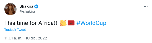La cantante colombiana Shakira se sumó a la oleada de felicitaciones a Marruecos en redes sociales por su histórica clasificación a semifinales del Mundial de Qatar 2022 tras vencer por 1-0 a Portugal."This time for Africa!! (Esta vez por África!!)", escribió en Twitter, acompañando su mensaje de un emoji de aplauso y otro de la bandera marroquí.Los Leones del Atlas se convirtieron en la primera selección africana en llegar a semifinales de un Mundial, superando el techo de los cuartos, donde se habían estrellado en el pasado Camerún (1990), Senegal (2002) y Ghana (2010).En esa edición de hace doce años, en Sudáfrica 2010, Shakira interpretó el recordado himno "Waka Waka", que incluye esa frase de "This time for Africa", que ahora aprovecha ante el hito de los marroquíes.El Mundial de Sudáfrica 2010 fue el primero de la historia en jugarse en suelo africano.En el futbol se sucedían las reacciones a la hazaña de Marruecos."Una victoria sensacional para Marruecos. Valiente, encendido, organizado, tranquilo y merecido. El primer equipo africano en llegar a una semifinal del Mundial. Bien jugado", escribió en Twitter el exfutbolista inglés Gary Lineker.En la misma red social, el ex atacante marfileño Didier Drogba también felicitó a los marroquíes."¡Ya está, lo lograron! Bravo Marruecos por este éxito. ¡Viva África! Walid Regragui (seleccionador de Marruecos), hermano, estoy muy contento por ti", dijo el ex del Chelsea.El exfutbolista camerunés y actual presidente de la Federación de su país, Samuel Eto'o, afirmó que todo el continente apoya ahora a Marruecos: "¡Increíble! Marruecos es el primer país africano en alcanzar las semifinales. ¡Todo el continente os apoya!".El exdefensa marroquí Mehdi Benatia, ahora comentarista de la televisión beIN Sports, dijo que lo conseguido era "increíble"."Estamos en semifinales del Mundial, ni me lo creo. Tengo la piel de gallina. Es increíble. Merece un gran respeto lo que han conseguido. Los chicos lo han dado todo", dijo.La Confederación Africana de Futbol (CAF) también se sumó a la oleada de felicitaciones en Twitter: "¡HISTORIA DEL CONTINENTE! Marruecos se convierte en el primer país africano en llegar a semifinales del Mundial. ¡Qué logro para los Leones del Atlas!".El presidente de Senegal, Macky Sall, también envió un mensaje."¡Histórico! ¡Y fantástico! Los Leones del Atlas se clasificaron a semifinales del Mundial. Bravo, Marruecos", exclamó.OF
