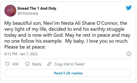 El hijo de 17 años de Sinead O'Connor, Shane, fue encontrado muerto en Irlanda el viernes después de que la cantautora irlandesa notificara a las autoridades sobre su desaparición.La policía dijo que el caso de desaparición se cerró después de que se encontrara un cuerpo en la ciudad costera oriental de Bray, a unos 20 kilómetros al sur de Dublín.O'Connor publicó en Twitter que su hijo, "la misma luz de mi vida, decidió terminar su lucha terrenal hoy y ahora está con Dios. Que descanse en paz y que nadie siga su ejemplo. Mi bebé, te quiero mucho. Descansa por favor".Anteriormente, la cantante de 55 años había acudido a las redes sociales para pedirle a su hijo que no se lastimara. Precisó que había sido hospitalizado después de dos intentos de suicidio.Shane era uno de los cuatro hijos de O'Connor. Su padre era el músico irlandés Donal Lunny.O'Connor se hizo famosa por su deslumbrante versión de 1990 de la canción de Prince "Nothing Compares 2 U". Ella surgió de una familia abusiva en Irlanda y ha sido abierta sobre su propia lucha con una enfermedad mental.JM