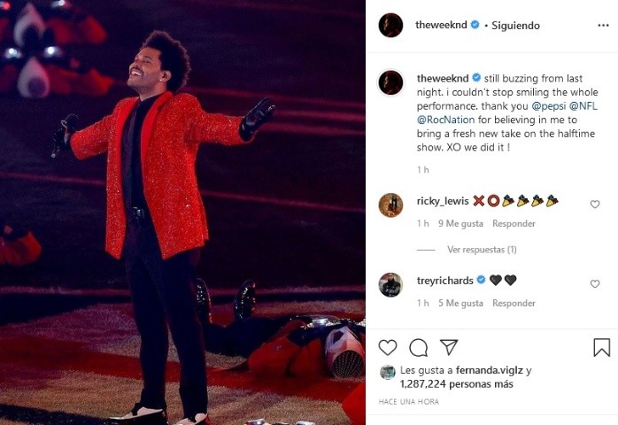 The Weeknd se convirtió en el artista que ofreció el espectáculo de medio tiempo del Super Bowl 2021. A pesar de las críticas y las opiniones divididas que generó en redes sociales, el cantante canadiense se mostró feliz por el trabajo logrado.A través de su cuenta de Instagram Abel Makkonen agradeció a los organizadores y a la NFL por "creer en mí para traer una nueva visión del espectáculo del medio tiempo"."Sigo emocionado por anoche. No pude dejar de sonreír durante toda la actuación. gracias @pepsi @NFL @RocNation por creer en mí para traer una nueva visión del espectáculo del medio tiempo. Lo hicimos!, escribió.La publicación de The Weeknd obtuvo más de un millón de "me gusta" y cientos de comentarios por parte de sus seguidores. También amigos y colegas del medio felicitaron al cantente de "I Feel it Coming".El estadio Raymond James recibió el espectáculo de medio tiempo del Super Bowl 2021 con The Weeknd, cantante canadiense que interpretó siete canciones en poco menos de quince minutos de presentación.Contrario a los rumores que circularon los días previos, al músico no lo acompañaron invitados especiales. Los temas que entonó fueron "Starboy", "The Hills", "I Can't Feel My Face", "I Feel It Coming", "Save Your Tears", "Earned It" y "Blinding Lights". En cada tema la escenografía se fue modificando, en momentos con un constante trabajo de cámaras en la producción.