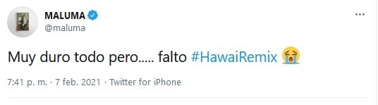 Después de los rumores que surgieron sobre los posibles invitados que tendría The Weeknd durante su presentación en el Super Bowl 2021, Maluma reaccionó y mandó mensaje al cantante canadiense.Maluma se hizo tendencia en Twitter tras una publicación en donde señala que faltó el remix de su éxito "Hawai"."Muy duro todo pero..... falto #HawaiRemix", escribió.El tuit generó de inmediato más de siete mil me gusta, así como cientos de comentarios.En noviembre del año pasado, Maluma lanzó el remix de Hawai, canción que se desprende su su álbum con el mismo nombre.En el tema, The Weeknd canta en español y logró posicionarse dentro de los primeros lugares de reproducciones en Spotify.El estadio Raymond James recibió el espectáculo de medio tiempo del Super Bowl 2021 con The Weeknd, cantante canadiense que interpretó siete canciones en poco menos de quince minutos de presentación.Contrario a los rumores que circularon los días previos, al músico no lo acompañaron invitados especiales. Los temas que entonó fueron "Starboy", "The Hills", "I Can't Feel My Face", "I Feel It Coming", "Save Your Tears", "Earned It" y "Blinding Lights". En cada tema la escenografía se fue modificando, en momentos con un constante trabajo de cámaras en la producción.