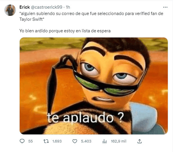 Luego de la noticia que dio la famosa cantante Taylor Swift por medio de sus redes sociales enloqueciendo a sus fans tras su llegada a la ciudad de México las fechas 24, 25, 26 y 27 de agosto de este año, se volvió un reto de “a ver quién se los gana primero”. Pues el concierto de Taylor es muy esperado por el público mexicano y en la medida de lo posible quieren obtener un asiento para disfrutar de su artista favorita. Por otra parte, la plataforma Ticketmaster pidió a los "swifties" hacer un "Verified Fan" para ingresar a la fila virtual, y así comprar entradas a los shows que va a brindar Taylor Swift el próximo mes de agosto en el Foro Sol de CDMX. LEE TAMBIÉN: ¡Ojo! Estas son las series y películas que desaparecerán de Netflix en julioSin embargo, las quejas a la empresa han sido recurrentes debido a la escasez de tickets a los conciertos al poco tiempo de activar la venta en el sitio oficial. Ya no se diga, tratándose de un concierto de gran demanda como lo es el de Taylor Swift. Cabe señalar, que Ticketmaster admite que los clientes registrados en el "Verified Fan" obtengan un correo electrónico con el código de acceso a la fila virtual. Aunque no es garantía que obtengan los boletos. El sistema estuvo hábil desde el pasado 2 de junio y finalizó el 5 del mismo mes, y en caso de no recibir el correo electrónico con el código para formarse en la fila virtual, los cibernautas pasarán a una lista de espera. Asimismo, este lunes 12 de junio los "Swift Lovers" comienzan a recibir el mail con la información necesaria para acelerar la ganga de los boletos. Finalmente, la emoción es máxima por ver a la intérprete de los siguientes sencillos musicales como: "Blank Space", "Bad Blood", "Karma", “Anti-Hero”, “Style”, “Cardigan” entre otras. A través de redes sociales hay quienes ya informaron haber conseguido el código. Mientras que otros fanáticos siguen en espera y esperan que Ticketmaster les haga llegar el pase para la fila virtual lo más rápido posible. Incluso, hasta hicieron memes referente a ello. A continuación, te los mostramos. SN