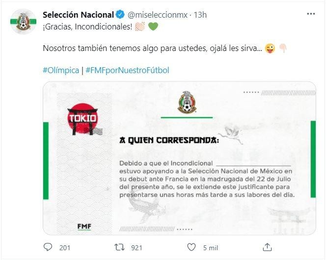Los Juegos Olímpicos de Tokio 2021 ya comenzaron y serán transmitidos en vivo, sin embargo, entre México y Japón son 14 horas de diferencia. Los amantes del deporte tendrán que desvelarse si no quieren perderse los encuentros.Así como pasó hoy, que fue el debut de la Selección Mexicana de futbol varonil contra la Selección de Tokio, cuyo partido se transmitió en vivo a las 3 de la mañana, hora de la Ciudad de México.La Selección Mexicana ganó el encuentro 4 goles contra 1 con tantos de Alexis Vega al 46', Sebastián Córdova al 54', Uriel Antuna al 79' y, finalmente, Eduardo Aguirre al minuto 90' en la última etapa del partido.A pesar del complicado horario muchos aficionados se dieron cita para ver el partido, pues incluso en las redes sociales fue más que notorio el optimismo por dicho juego, con muchos hashtags, "memes" y publicaciones.Debido a la gran actuación y agradeciendo el apoyo para los aficionados que se desvelaron viendo el partido, la Selección Mexicana emitió por medio de sus redes sociales, específicamente en Twitter, un "justificante" para todos aquellos que madrugaron, para que no tuvieran problemas en sus trabajos.Para poder ser utilizado dicho justificante únicamente tienen que entregarlo a quien sea necesario, pues se emitió con la leyenda: "a quien corresponda", y tiene la finalidad de permitir a los incondicionales que vieron el partido presentarse unas horas más tarde a sus labores del día. Esto es una broma, pero un gran detalle de parte de la selección nacional.Los siguientes partidos tendrán un horario un poco más amigable para los aficionados en México.Si te interesó esta noticia y quieres saber más, entonces descarga y descubre INFORMAPlus, la aplicación digital de EL INFORMADOR, en donde tenemos contenidos exclusivos, seleccionados por nuestros editores, para darles una experiencia más completa a los lectores.Descarga la aplicación y pruébala GRATIS por treinta días.Para iOS: https://apple.co/35jaVgbPara Android: https://bit.ly/3gwVSEVMB