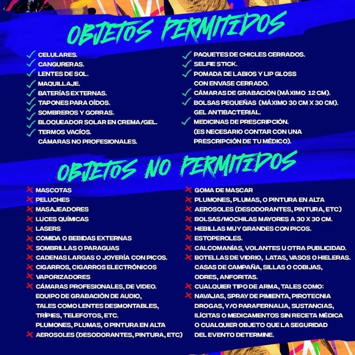 El festival Tecate Pa’l Norte 2024 comienza este viernes 29 de marzo con artistas diversos como Peso Pluma, Kendrick Lamar, Keane, entre muchos más. Por lo que si eres uno de los afortunados que podrá asistir aquí te compartimos los objetos permitidos y prohibidos para poder entrar.Este año, el Tecate Pa’l Norte promete grandes experiencias para sus asistentes, con artistas sorpresas y enormes pantallas para que todos puedan ver a sus cantantes favoritos, desde este 29 al domingo 31 de marzo.Para no caer en confusión y evitar que no puedas entrar al festival, los organizadores informaron sobre la lista de objetos prohibidos y permitidos para que los asistentes tomen sus medidas y disfruten al máximo del evento.Celulares, cangureras, lentes de sol, maquillaje, baterías externas, tampones para oídos, sombreros, gorras, bloqueador solar en crema o gel, termos vacíos, cámaras no profesionales, paquetes de chicles cerrados, selfie stick, pomada de labios cerrada, cámaras de grabación (máximo 12 centímetros), bolsas pequeñas (30 por 30 centímetros), gel antibacterial y medicinas de prescripción (en necesario llevar receta).Los siguientes son los objetos con los que ninguna persona puede entrar al festival en el Parque Fundidora. Mascotas, peluches, masajeadores, luces químicas, lásers, comida, bebidas, sombrillas o paraguas, cadenas largas, joyería con picos, cigarros, vapeadores cigarros electrónicos, plumones, plumas, tintas, pintura en lata, aerosoles (desodorantes, pintura, etc),bolsas o mochiles que superen los 30 por 30 centímetros, hebillas con picos, calcomanías, volantes, botellas de vidrio, hieleras, casas de campaña, cobijas, cualquier tipo de arma, drogas, medicamentos sin receta médica, sustancias ilícitas, cámaras de foto o video, drones y cornetas.NA