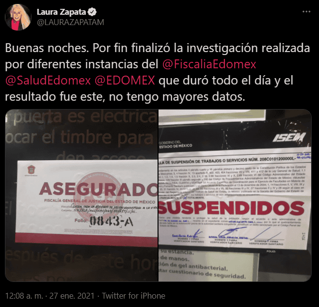 Tras la denuncia de Laura Zapata al silo por el maltrato que su abuela Eva Mange, autoridades del Estado de México han clausurado el lugar aunque los internos continúan dentro, incluyendo a la actriz Laura Zapara y su abuela Eva.El martes por la noche autoridades de Huixquilucan, llegaron al asilo Le Grand Senior Living, donde se encuentra doña Eva Mange para suspender y asegurar el lugar al que le pusieron sellos, así se dio a conocer en el matutino “Venga la alegría”.Antes de la suspensión, las autoridades correspondientes habían llegado por la tarde del martes para inspeccionar todo el lugar.Aseguraron que esta decisión la tomaron luego de detectar supuestas anomalías sanitarias dentro del inmueble.Por su parte, Laura Zapata, quien aún se encuentra con su abuela dentro de la casa de retiro, utilizó sus redes para denunciar que la continúan amedrentando."Al parecer es alguien que está aquí dentro, me sigue amenazando!!! Qué tal el valiente sin foto y sigue con su redacción inexplicable. @POLICIAEDOMEX este teléfono me está amenazando y tratando de intimidar", puso la actriz en su cuenta de Twitter el martes por la noche, minutos después de la suspensión del lugar.AC