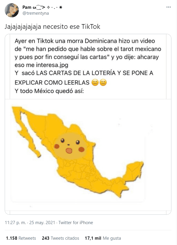 Un uso alternativo de la lotería tradicional mexicana está en el ojo del debate entre usuarios de redes sociales luego de que una tiktoker de origen puertorriqueño compartiera los propósitos adivinatorios del juego a manera de tarot.La usuaria, quien se hace llamar @bruja_cat en TikTok inicia un video en dicha red social explicando que recientemente le habían solicitado material sobre el “tarot mexicano” por lo que muestra un puñado de cartas que conforman la lotería y procede a dar el contexto histórico del juego, que a su decir data del siglo XV.Posteriormente explica el ampliamente difundido uso de la lotería como juego de mesa, añadiendo que al jugarlo las personas tienen que adivinar la imagen que deben marcar con base en el acertijo escrito en la descripción al reverso de cada carta; hace énfasis en que todos ignoran el número en la esquina superior de cada imagen.La usuaria separa incluso algunas cartas de la lotería tradicional indicando una gran similitud a otras de los arcanos mayores y en otro segmento del video muestra un puñado de cartas asociadas a la cultura mexicana indicando que éstas tienen propósitos adivinatorios.“Ayer en Tiktok una morra Dominicana (sic) hizo un video de “me han pedido que hable sobre el tarot mexicano y pues por fin conseguí las cartas” y yo dije ahcaray eso me interesa.jpg”, se lee en la imagen que comparte en Twitter la usuaria @trementyna.Tras la publicación de este video en Twitter, usuarios comenzaron a compartir sus impresiones sobre el material; algunos en tono de burla al no dar crédito a lo que veían y escuchaban, mientras otros apostando a que la lotería tradicional mexicana sí puede ser interpretada como una versión del tarot. Entre los comentarios hay quienes comparten incluso, experiencias graciosas en las que bromearon con alguien “leyendo” cartas de la lotería resultando en atinadas coincidencias.“Me dio un aneurisma cuando dijo que eran cartas adivinatorias del siglo XV (1760) y bueno... sigan sin mi, esto es mucha comedia (sic)”, compartió @trementyna en un tuit en el que incluye el momento de la explicación.