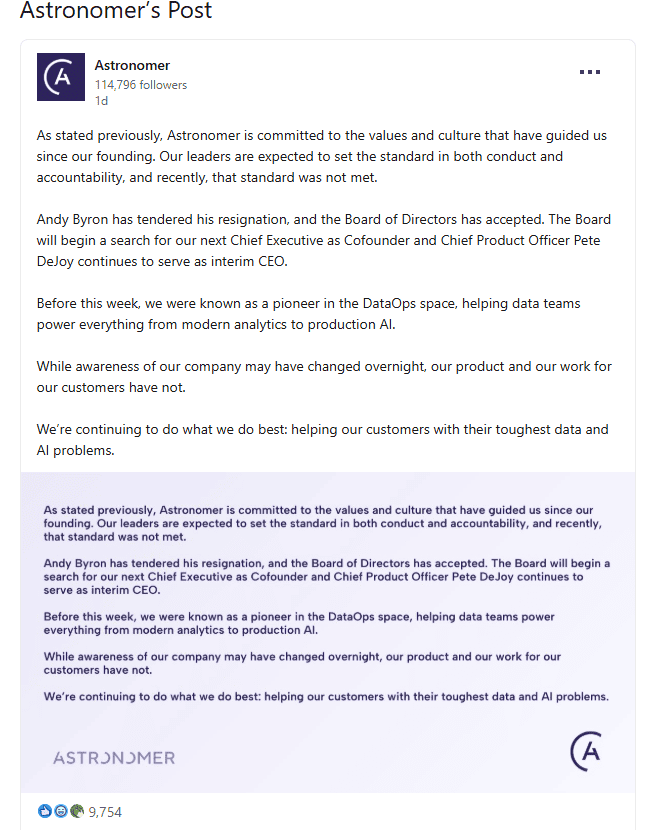 Luego de que el video en el que aparece el que fuera director general de Astronomer Inc. abrazando a una empleada de la misma empresa en un concierto de Coldplay, fuese ampliamente difundido y convertido en tendencia prácticamente en todo el mundo, Andy Byron, protagonista de la situación, ha renunciado y la directiva ha aceptado la renuncia.Esto dice el comunicado de Astronomer Inc. en LinkedIn."Astronomer está comprometida con los valores y la cultura que nos han guiado desde nuestra fundación. Se espera que nuestros líderes establezcan el estándar tanto en conducta como en responsabilidad, y recientemente, ese estándar no se cumplió", dijo la empresa en su publicación en dicha red social.La medida se produce un día después de que la empresa anunciara que Byron había sido puesto en licencia y que la junta directiva había iniciado una investigación formal sobre el incidente de las pantallas gigantes, que se volvió viral. Un portavoz de la empresa confirmó posteriormente en un comunicado a AP que eran Byron y la directora de personal de Astronomer, Kristin Cabot, quienes aparecían en el video.El breve clip de video muestra a Byron y Cabot captados en el jumbotron en el Gillette Stadium en Foxborough, Massachusetts, durante un concierto de Coldplay el miércoles.El cantante principal Chris Martin pidió a las cámaras que escanearan a la multitud para su "Canción del Jumbotron", cuando canta unas líneas sobre las personas en las que la cámara se detiene."O están teniendo una aventura o son muy tímidos", bromeó ante la reacción apenada del par.Detectives de internet identificaron al hombre como el director ejecutivo de una empresa con sede en Estados Unidos y a la mujer como su directora de personal.Pete DeJoy, cofundador y director de producto de Astronomer, ha sido designado como CEO interino mientras la empresa lleva a cabo una búsqueda del sucesor de Byron.Es fácil pasarlo por alto, pero la mayoría de los lugares de conciertos tienen letreros que informan a la audiencia que podrían ser filmados durante el evento. Búsquelos en las paredes cuando llegue y alrededor de las áreas de bares o baños. Es una práctica común, especialmente cuando a las bandas les gusta usar actuaciones para videos musicales o películas de conciertos.El lugar en este caso, el Gillette Stadium en Foxborough, también tiene una política de privacidad en línea que establece: "Cuando visita nuestro local o asiste o participa en un evento en nuestro local, podemos capturar su imagen, voz y/o semejanza, incluso a través del uso de cámaras CCTV y/o cuando lo filmamos o fotografiamos en un lugar público"."Probablemente, se habrían salido con la suya si no hubieran reaccionado", dijo Alison Taylor, profesora asociada clínica en la Escuela de Negocios Stern de la Universidad de Nueva York. Y para cuando las supuestas identidades surgieron en las redes sociales, tocó un nervio clásico sobre "líderes que actúan como si las reglas no se aplicaran a ellos", agregó.Aun así, Taylor y otros destacan lo rápido que un video así puede llevar a una búsqueda en internet para encontrar a las personas involucradas, y señalan que es importante recordar que tal "doxing" (exponer identidades y antecedentes) no se reserva solo para personas famosas. Más allá de que alguien simplemente reconozca un rostro familiar y lo difunda, los avances tecnológicos, como la creciente adopción de la inteligencia artificial, han hecho que sea más fácil y rápido en general encontrar a casi cualquier persona en un video viral hoy en día."Es un poco inquietante lo fácil que podemos ser identificados con biometría, cómo nuestros rostros están en línea, cómo las redes sociales pueden rastrearnos, y cómo internet ha pasado de ser un lugar de interacción a un sistema de vigilancia gigantesco", dijo Mary Angela Bock, profesora asociada en la Escuela de Periodismo y Medios de la Universidad de Texas en Austin. "Cuando lo piensas, estamos siendo vigilados por nuestras redes sociales. Nos están rastreando a cambio de entretenernos".* * * Mantente al día con las noticias, únete a nuestro canal de Whatsapp * * *OB