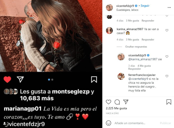 Vicente Fernández Jr. lo tiene muy claro: va por su tercera boda y esta vez con Mariana González, apodada "la Kim Kardashian mexicana", con quien lleva poco más de un año de relación. La voluptuosa mujer originaria de Jalisco ha presumido en redes sociales el amor que la une con el hijo de don Vicente Fernández.González Padilla nació el 7 de febrero de 1983 en Tepatitlán y, según reportes, abrió por primera vez sus ojos en el seno de una familia que se dedica a la comercialización de huevo.La noticia de la futura boda de Vicente y Mariana fue dada a conocer por el mismo cantante de música ranchera, quien respondió a la pregunta de una de sus followers. La foto publicada por Vicente Jr. en Instagram se trata de un apasionado beso con la sensual modelo, quien contendió como diputada del distrito 3, en Jalisco, por el Partido Encuentro Solidario, pero perdió.La relación de esta pareja ha estado envuelta en varias polémicas: una de ellas es por la gran diferencia de edades, pues mientras Vicente tiene 57 años, su novia 38; también porque Mariana ha sido relacionada con el secuestro del policía federal Mauricio Arriaga, según lo ha asegurado la hermana del también fallecido.Por esa razón, el hijo del "Charro de Huentitán" ha amenazado con denunciar a quien se atreva a difamar a su pareja, quien ha negado esos rumores.Vicente Fernández Jr. ha tenido varias parejas: la mamá de sus hijos se llama Sissi, luego se casó con la periodista Mara Patricia Castañeda y por último también estuvo con Karina Ortegón, quien reveló supuestas agresiones y abusos del cantante.Por su parte, Mariana González es mamá de un niño, a quien recientemente le celebró su cumpleaños con una gran fiesta.Sigue leyendo…Si te interesó esta noticia y quieres saber más, entonces descarga y descubre INFORMAPlus, la aplicación digital de EL INFORMADOR, en donde tenemos contenidos exclusivos, seleccionados por nuestros editores, para darles una experiencia más completa a los lectores.Descarga la aplicación y pruébala GRATIS por treinta días.Si eres suscriptor de EL INFORMADOR tu acceso está incluido, solicítalo al 33 3678-7777AF