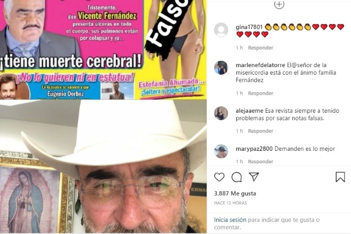 Desde este lunes trascendió en una revista de circulación nacional que Vicente Fernández tiene muerte cerebral, algo que fue desmentido por su hijo Vicente Fernández Jr. en redes sociales.Para Vicente Jr. ver este tipo de “noticias falsas” es “muy triste”, ya que su familia y los médicos del hospital en el que Vicente se encuentra comparten información sobre el estado de salud de “El Charro de Huentitán”.“Totalmente inventada con el afán de lucro con el público de mi padre”, escribió Vicente Fernández Jr. en su cuenta de Instagram. Además, llamó a quien compartió la noticia y a la revista a comprobar la veracidad del reportaje. “Es un asco que engañen al público de tal manera”, agregó Vicente Jr. De acuerdo al informe médico compartido este lunes, Vicente Fernández permanece estable pero débil. El comunicado subraya el conocimiento de la familia Fernández Abarca y del público en general de su preocupación por la salud del cantante desde su ingreso en agosto pasado.“Su familia ha estado a su lado en este proceso de enfermedad desde su ingreso hospitalario, mismo que ha limitado la calidad de vida y ahora dependiente en forma continua de cuidados especializados de la salud”, se lee en el comunicado.Los médicos hacen hincapié en que, por el tipo de enfermedad y secuelas presentadas hasta el momento, Vicente Fernández se mantiene en un estado estacionario “con progresión lenta por lo cual no muestra cambios trascendentes en su estado de salud. Actualmente se encuentra estable, en estado despierto, consciente con interacción con su familia al momento de su visita”.No es la primera vez que se comparte información falsa sobre el estado de salud de Vicente Fernández, apenas hace unos días se dio a conocer que supuestamente Doña Cuquita —esposa de Vicente— pidió a los médicos desconectarlo para que no sufriera más.No obstante, fue el mismo Vicente Fernández Jr. quien compartió un video en redes sociales para desmentir de nuevo el rumor.AC