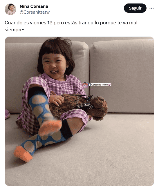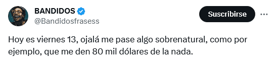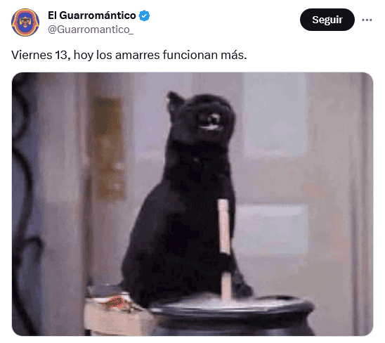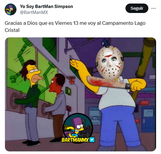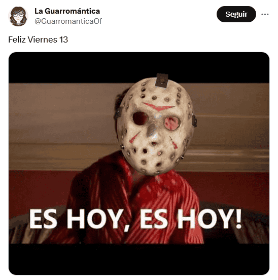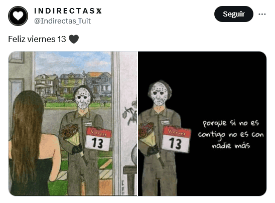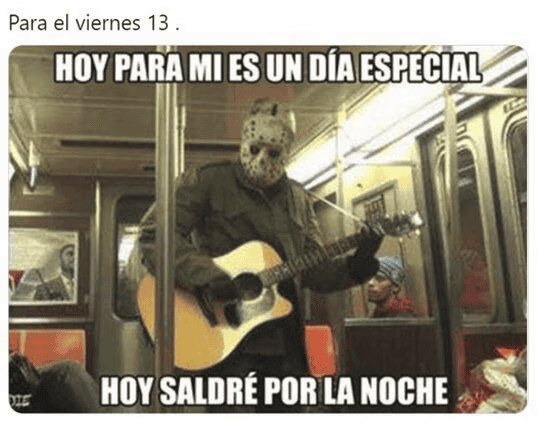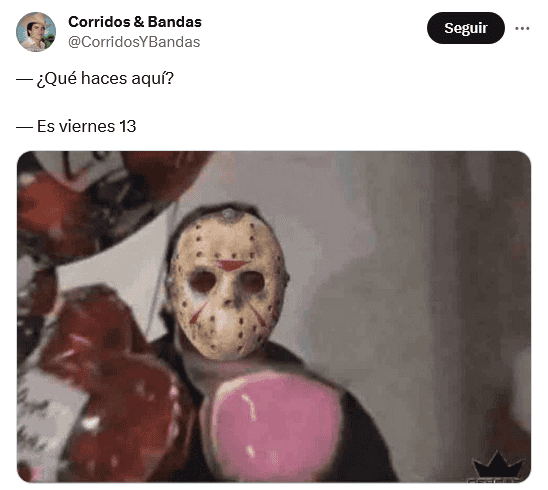 Otra vez es viernes 13 de 2023, pero del mes de octubre, un día calificado por muchos como símbolo de mala suerte en la mayor parte de las culturas anglosajonas, y que es visto también así en América Latina aunque con el martes 13. La primera fecha, como es costumbre, ha ocasionado la publicación de numerosos memes divertidos, por parte de mexicanos, que buscan burlarse de todos los crédulos.La superstición que existe en torno al viernes 13 es que se debe tener cuidado y evitar realizar ciertas acciones, como, por ejemplo, pasar por enfrente de un gato negro, no pisar un espejo roto, o caminar debajo de una escalera, y otras más también con carácter un tanto absurdo.La mayoría de los memes que circulan en días como hoy tienen como protagonista a "Jason Voorhees", un personaje de la saga de terror "Viernes 13". Apareció por primera vez en las películas como el hijo de la cocinera de un campamento convertida en asesina."Jason Voorhees" es muy recordado por su imagen siniestra: en las manos lleva un cuchillo y porta una máscara, ambos cubiertos con sangre. También es un personaje muy recurrente en las celebraciones y fiestas de Halloween, que tendrá lugar el próximo 31 de octubre. OF